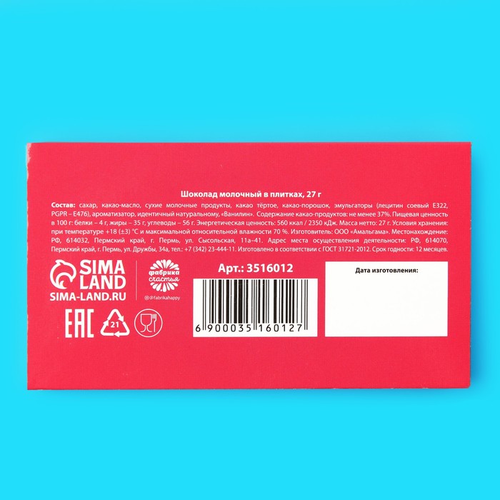 | Примечание | Температурный режим при хранении: от +5 до +25 °C Обратите внимание на условия хранения товара, которые указаны на упаковке. Дата изготовления зависит от партии поставки. При оформлении заказа, просим запрашивать актуальные сроки годности у менеджера. Полная информация о продуктах ТМ «Фабрика Счастья» |