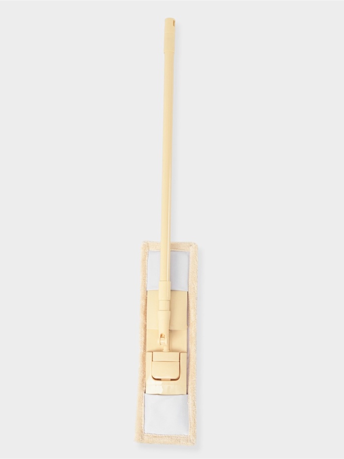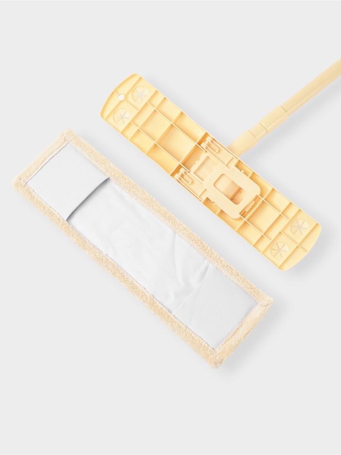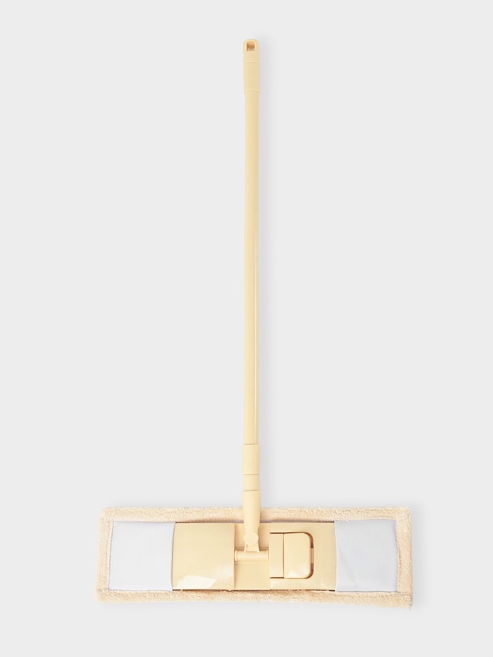 Плоская бежевая швабра с телескопической ручкой — инструмент для быстрой и комфортной уборки. Продуманная конструкция и практичные материалы делают процесс мытья пола простым и эффективным.