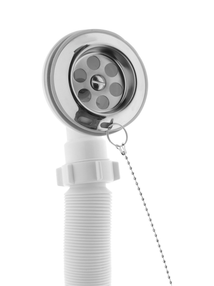 Сифон для ванны с литым выпуском и пробкой, диаметр 1 ½ дюйма, гофрированная труба 40×50 мм — сливной комплект для подключения ванны к канализации. Включает литой выпуск с пробкой и гибкую гофрированную трубу сечением 40×50 мм. Диаметр выпуска 1 ½ дюйма подходит для стандартных ванн. Отвод для стиральной машины отсутствует.