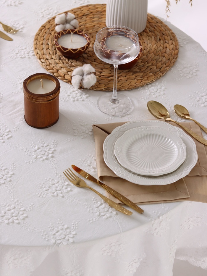 Скатерть подходит для сервировки обеденной зоны на кухне или в столовой. Гладкая хлопковая поверхность демонстрирует устойчивость к частому использованию. Модель выбирают для создания уютной атмосферы во время семейных трапез.