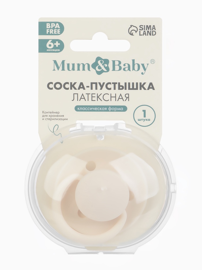 Технические характеристики Соска-пустышка, от 6 мес., латекс, классическая, в контейнере, айвори, M&B