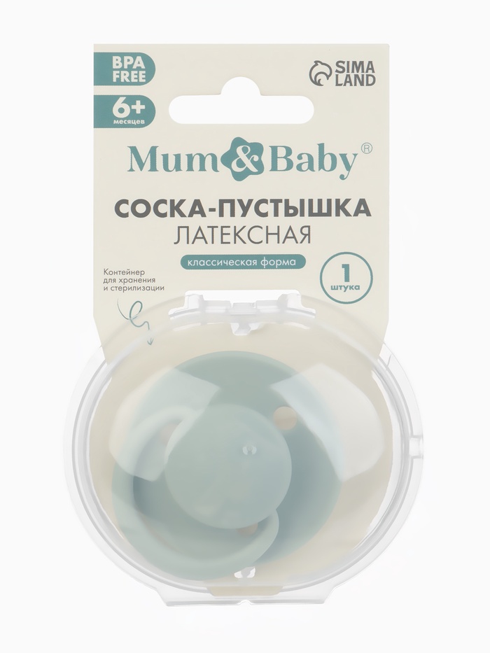 Технические характеристики Соска-пустышка, от 6 мес., латекс, классическая, в контейнере, серо-зелёная, M&B