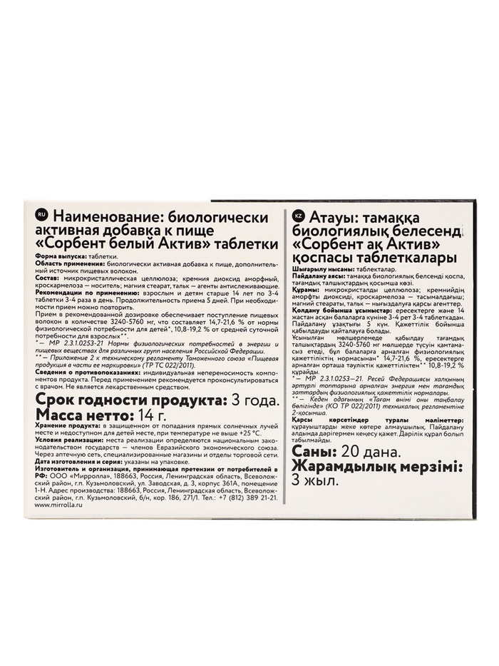 Сорбент белый Актив, очищение организма и поддержка ЖКТ, 20 таблеток