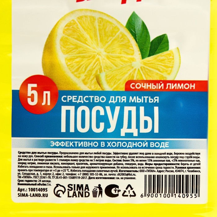 Технические характеристики Средство для мытья посуды, 5 л, аромат лимона, РУССКАЯ ВЫГОДА