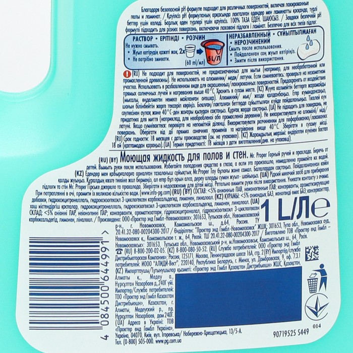 Способ применения: растворите 60 мл средства в 5 л воды. Не ополаскивайте и вытирайте поверхности насухо.