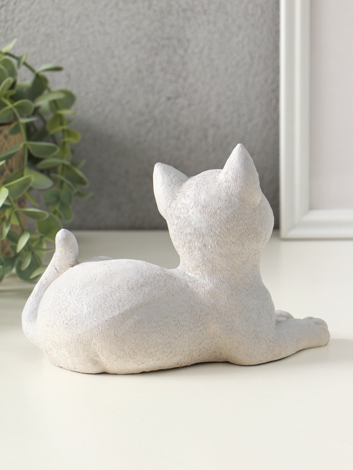 Эта гипсовая фигурка лежащей кошки — воплощение спокойствия и умиротворения для вашего дома. Её компактный размер и нейтральный серый цвет делают её универсальным акцентом, который впишется в любой интерьер, от минимализма до скандинавского стиля. Статичная, но полная жизни поза животного передаёт ощущение домашнего уюта и безмятежного отдыха.
