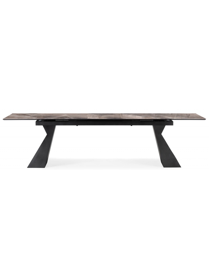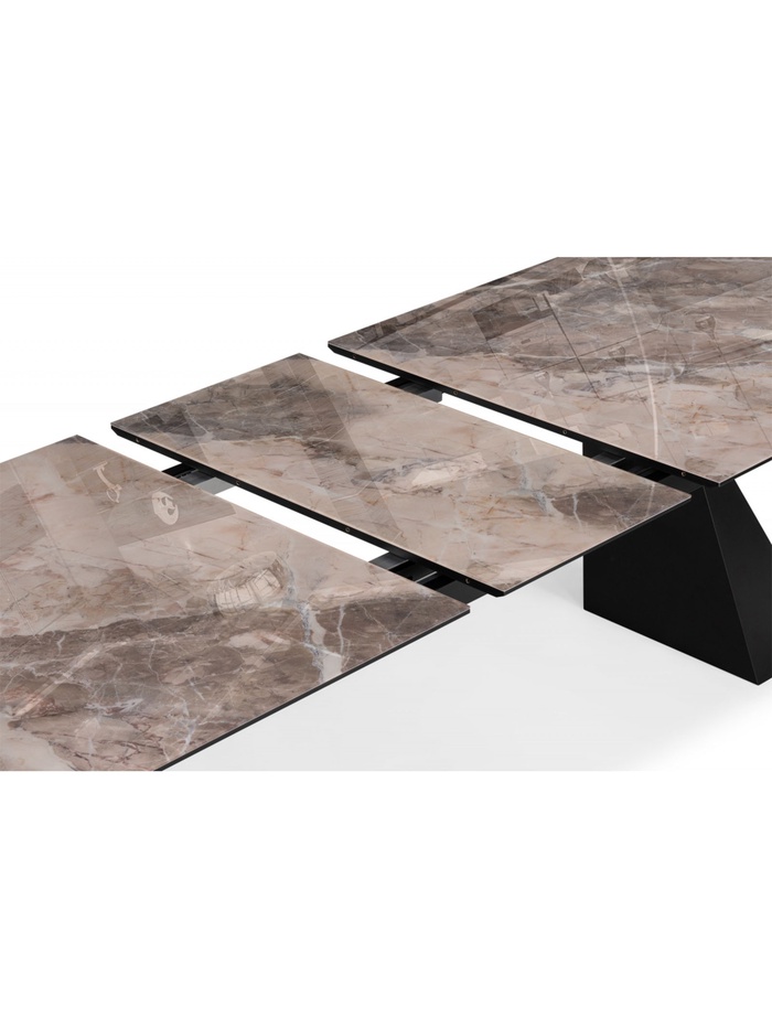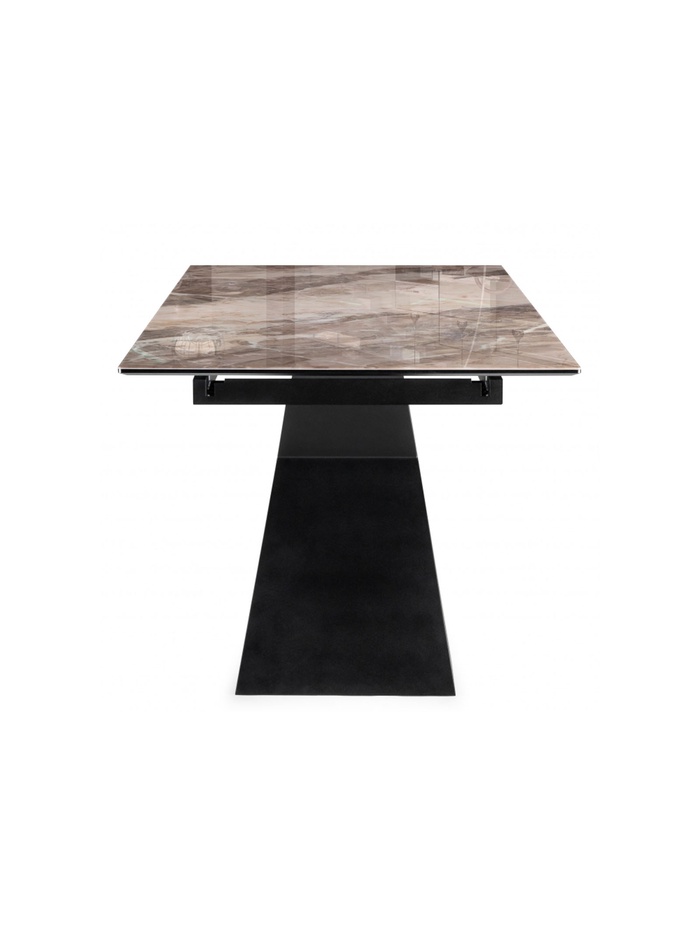 Столешница толщиной 2 см выполнена из прочного стекла, обеспечивая устойчивость к царапинам и легкость в уходе. Металлический каркас с черным покрытием гарантирует надежность и долговечность конструкции. Раздвижной механизм позволяет увеличивать длину стола с 240 до 290 см, а расстояние между ножками 170 см обеспечивает комфортное размещение сидящих.