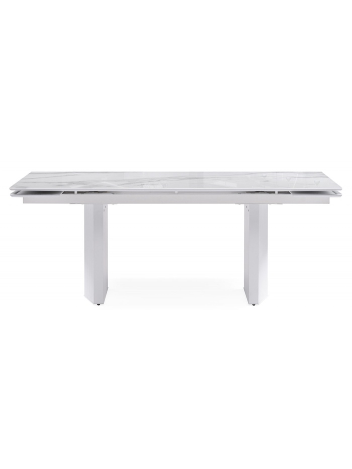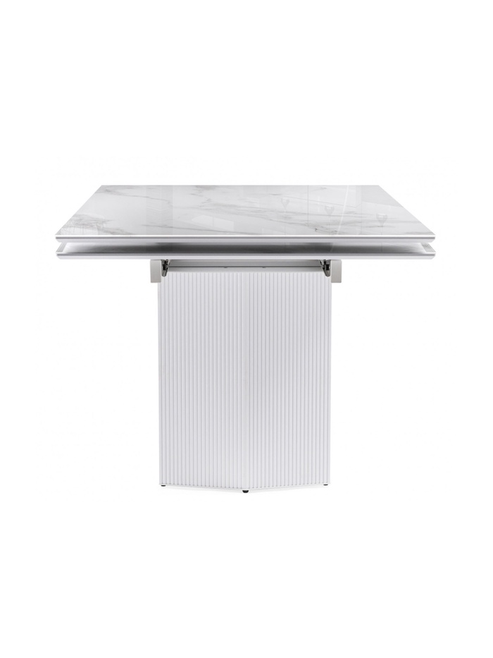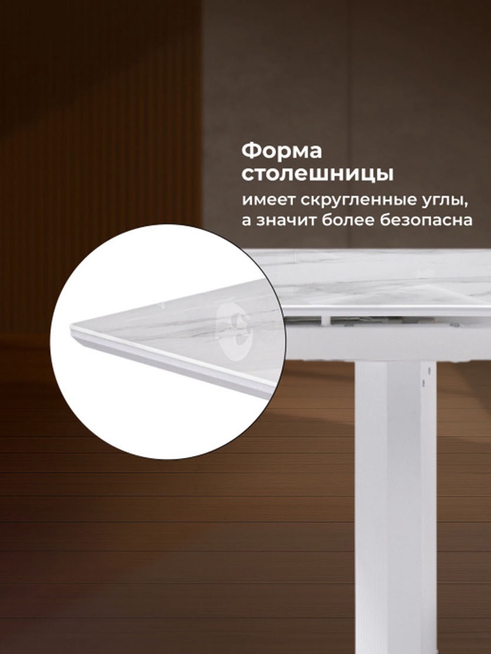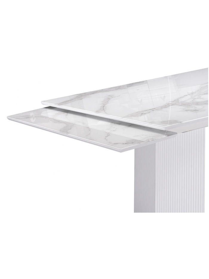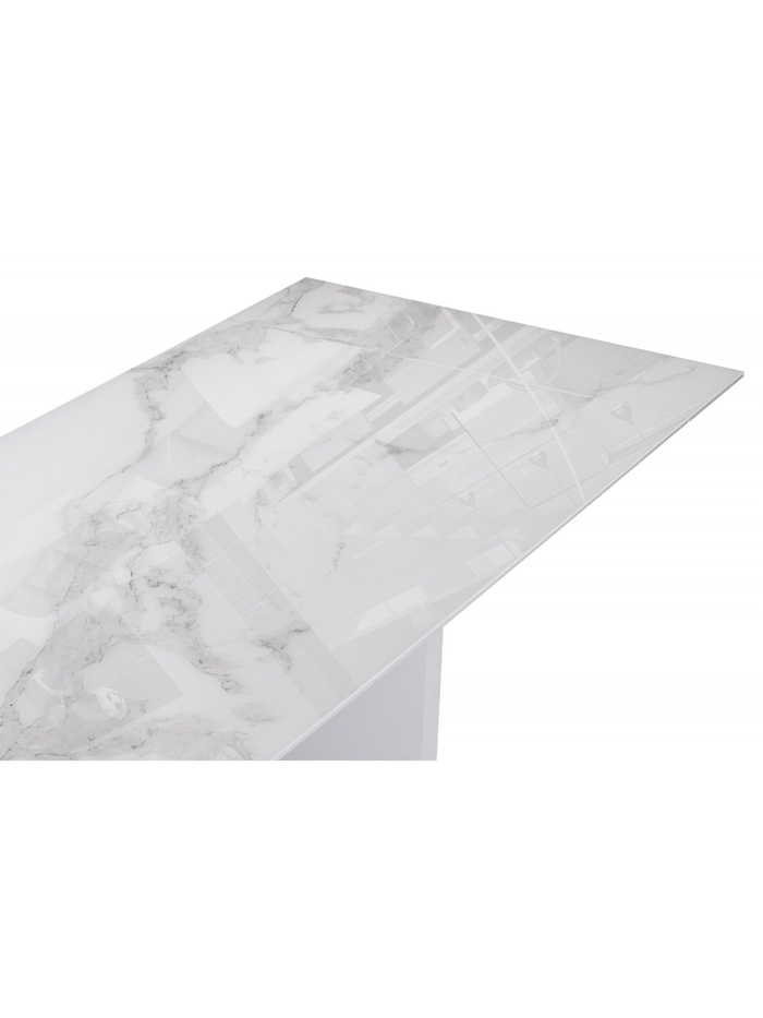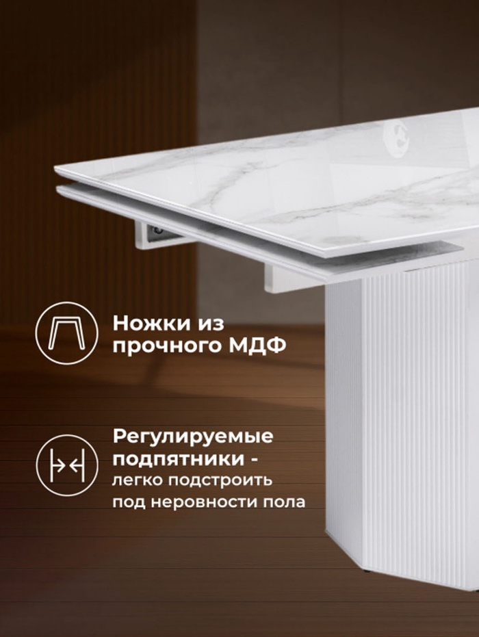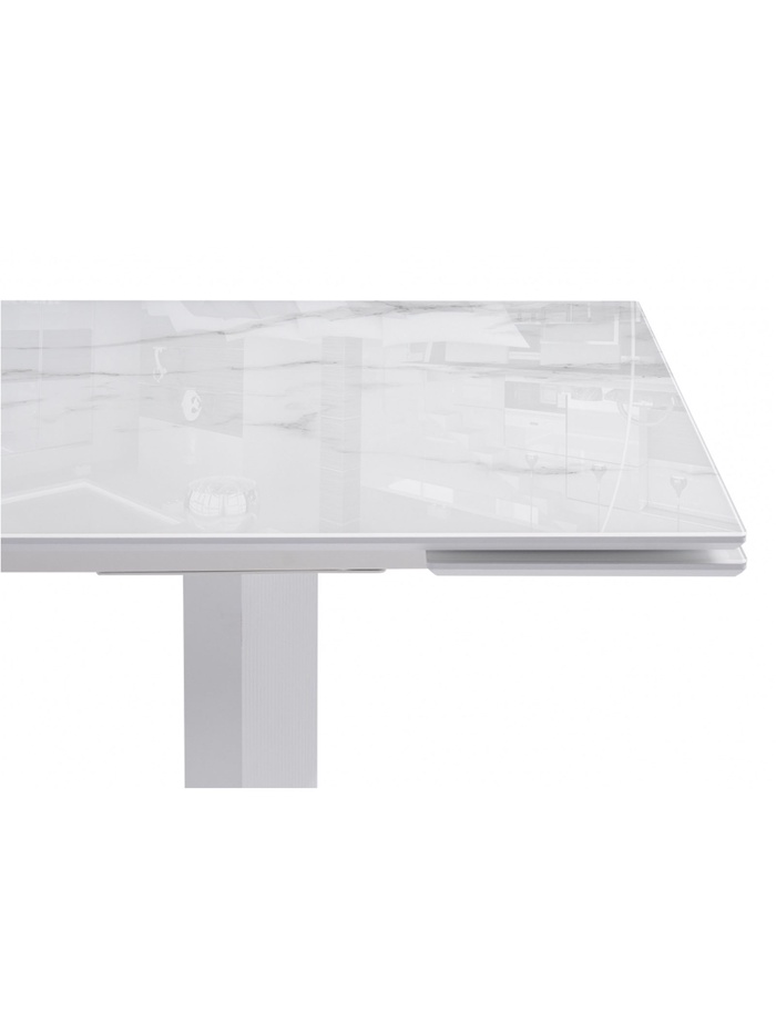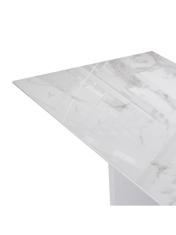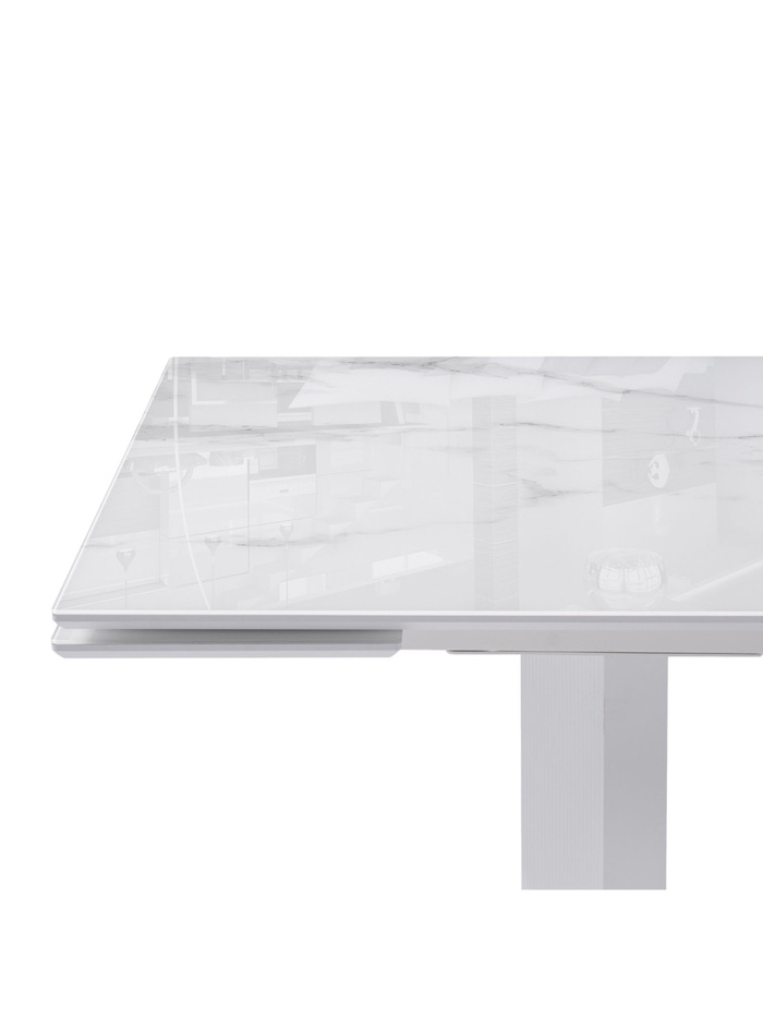 Великолепное и функциональное решение для просторной столовой или гостиной. Стол выполнен в светлом сочетании цветов: столешница из прочного стекла с эффектом белого мрамора и белые массивные ножки из МДФ создают элегантный и воздушный образ, наполняющий интерьер светом и свежестью.