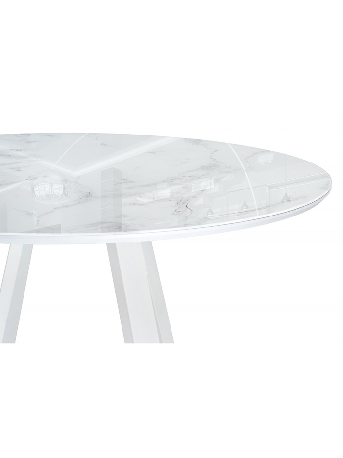 Светлое и элегантное решение для современной кухни или столовой. Круглый стол выполнен в белоснежном исполнении: столешница с эффектом белого мрамора создаёт ощущение чистоты, простора и природной гармонии, а белые металлические ножки придают конструкции цельность и визуальную лёгкость.