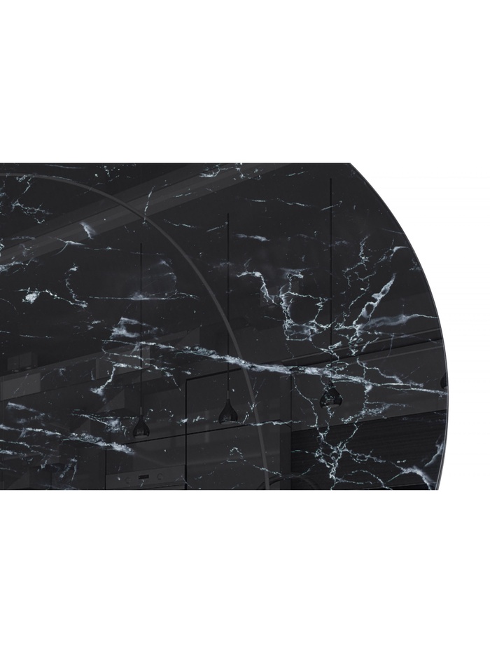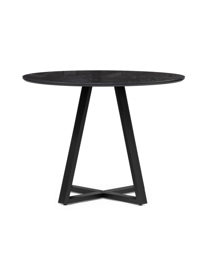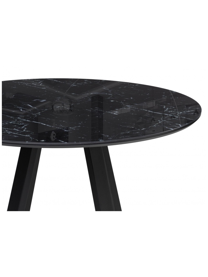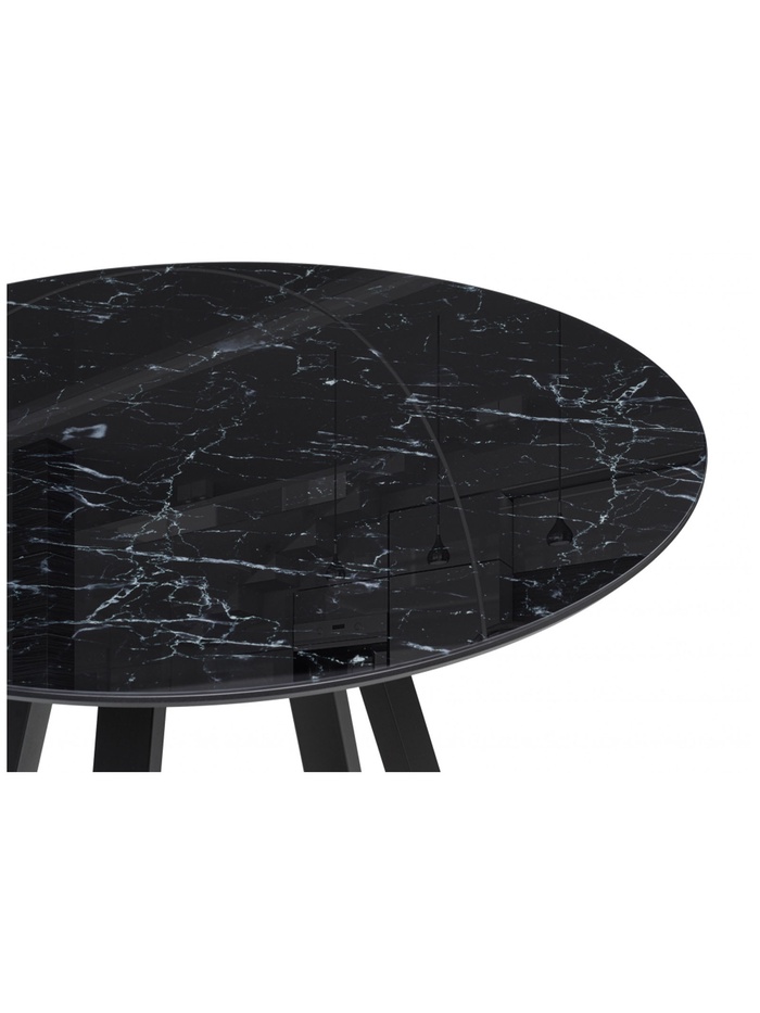 Изысканное и лаконичное решение для современной кухни или столовой. Круглый стол выполнен в благородном сочетании оттенков: столешница с эффектом чёрного мрамора создаёт ощущение роскоши и природной элегантности, а матовые чёрные металлические ножки придают конструкции устойчивость и графичность.