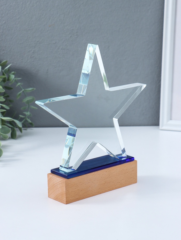 Эта наградная стела в форме звезды — универсальный символ достижений и признания. Её лаконичный дизайн сочетает природную теплоту дерева и торжественную ясность стекла, создавая сдержанный и элегантный акцент для любого события. Идеальный вариант для награждения сотрудников, поздравления ветеранов, чествования победителей конкурсов или вручения памятного подарка на юбилей.