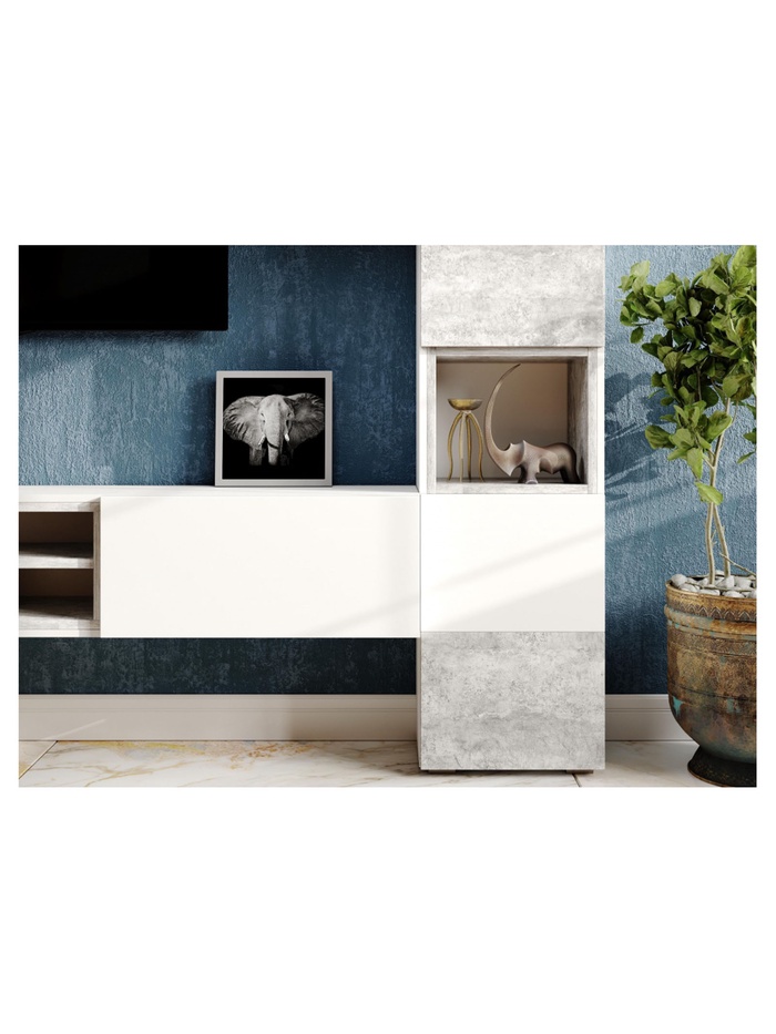- Индустриальный акцент: сочетание белого и фактурного бетона делает стеллаж не просто местом хранения, а самостоятельным декоративным элементом, формирующим стиль комнаты.