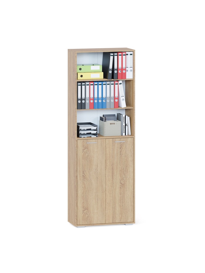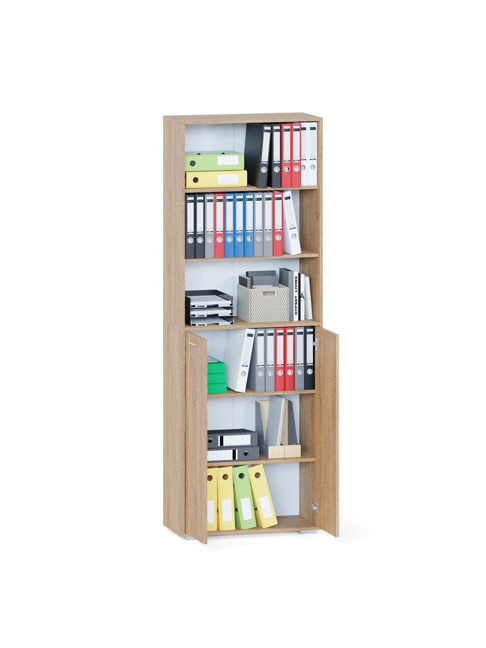 Стеллаж сочетает открытую и закрытую систему хранения. Верхняя часть оснащена тремя открытыми полками, которые обеспечивают быстрый доступ к книгам, папкам и декоративным элементам. Нижняя часть с распашными дверцами скрывает три дополнительные полки, позволяя удобно хранить вещи и поддерживать аккуратный внешний вид помещения.