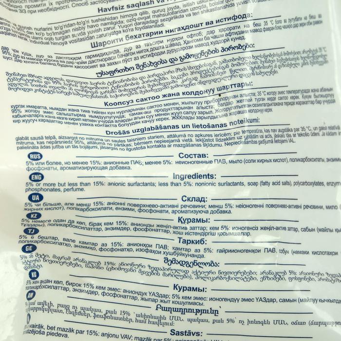 Состав:5% или более, но менее 15 %: анионные ПАВ; менее 5 %: неионогенные ПАВ, мыло (соли жирных кислот), поликарбоксилаты, энзимы, фосфонаты, ароматизирующая добавка