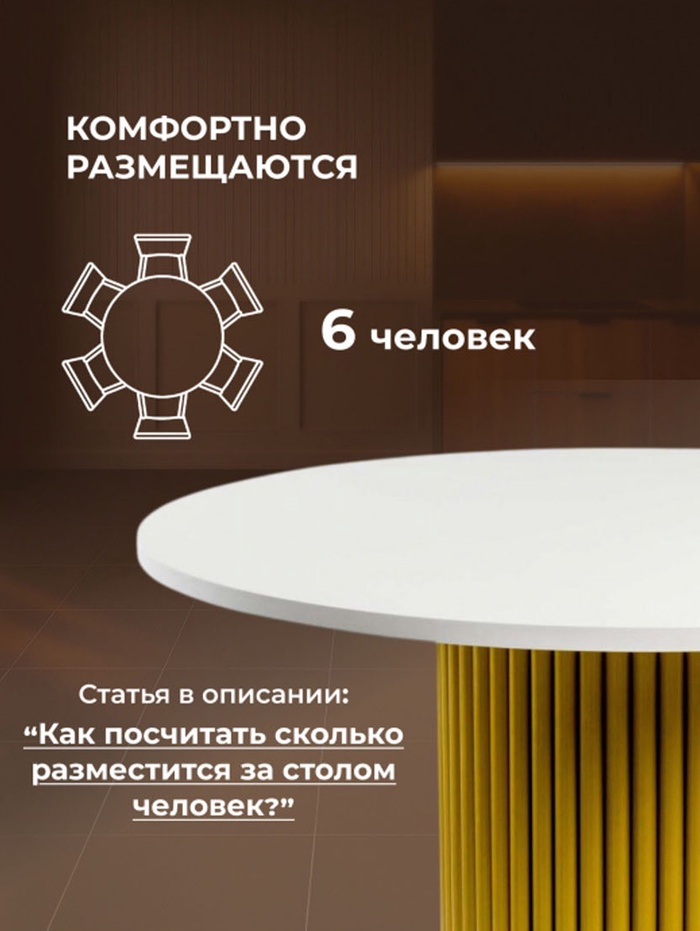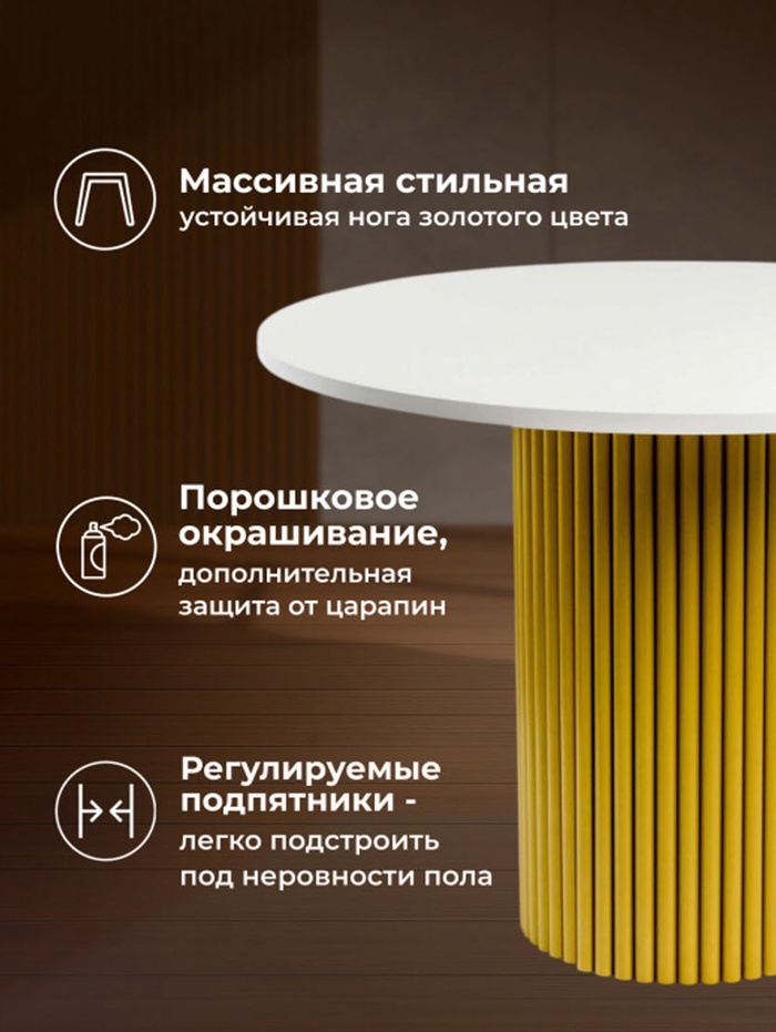 - Роскошный дизайн: сочетание белой столешницы и золотистых ножек создаёт элегантный и торжественный образ, который станет центральным акцентом интерьера.