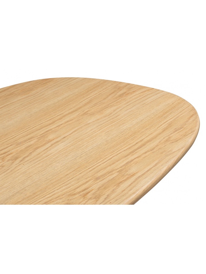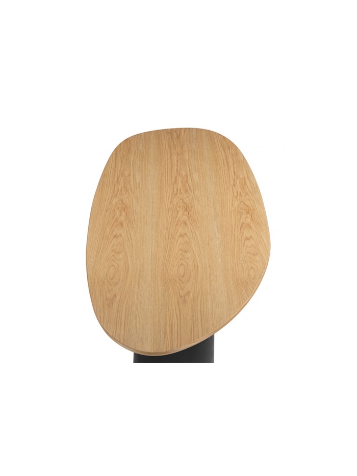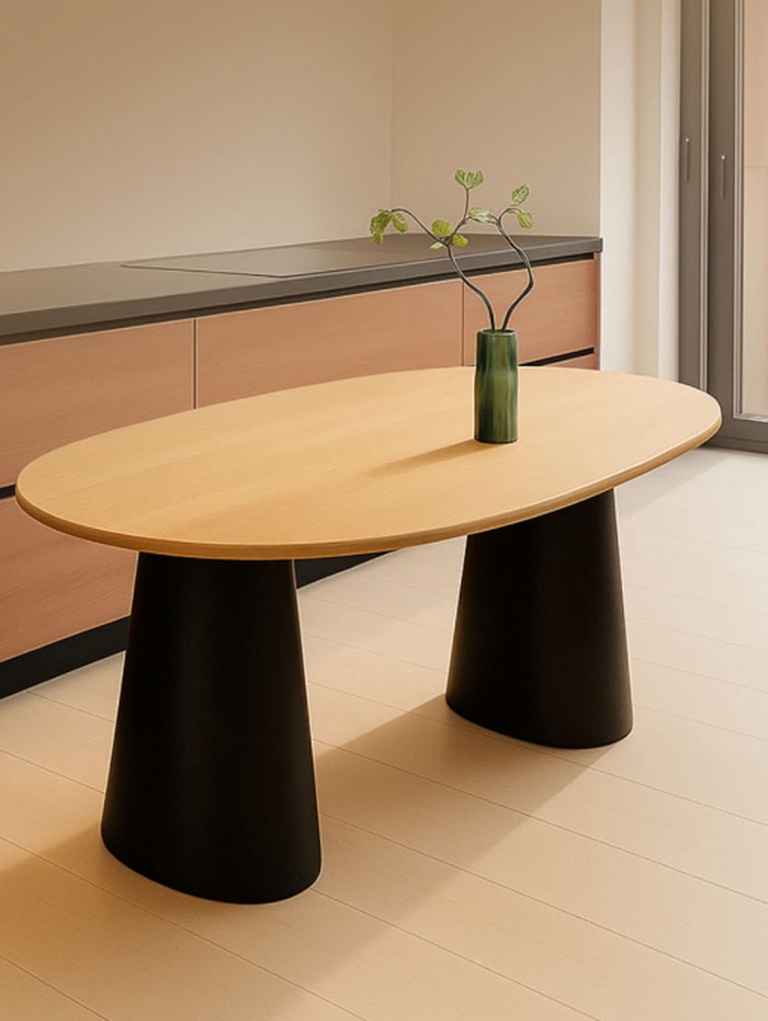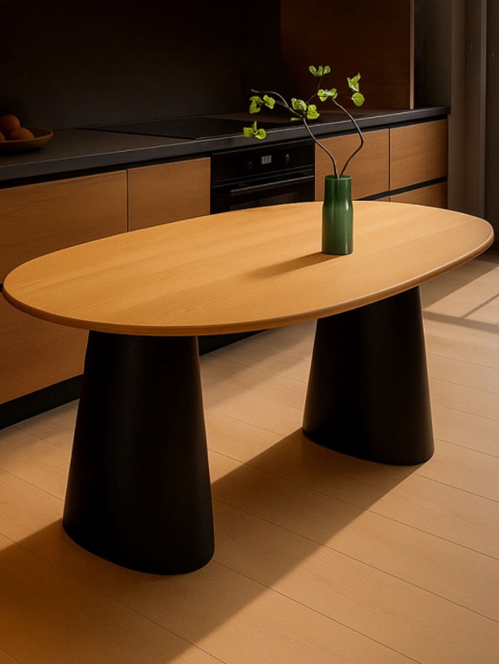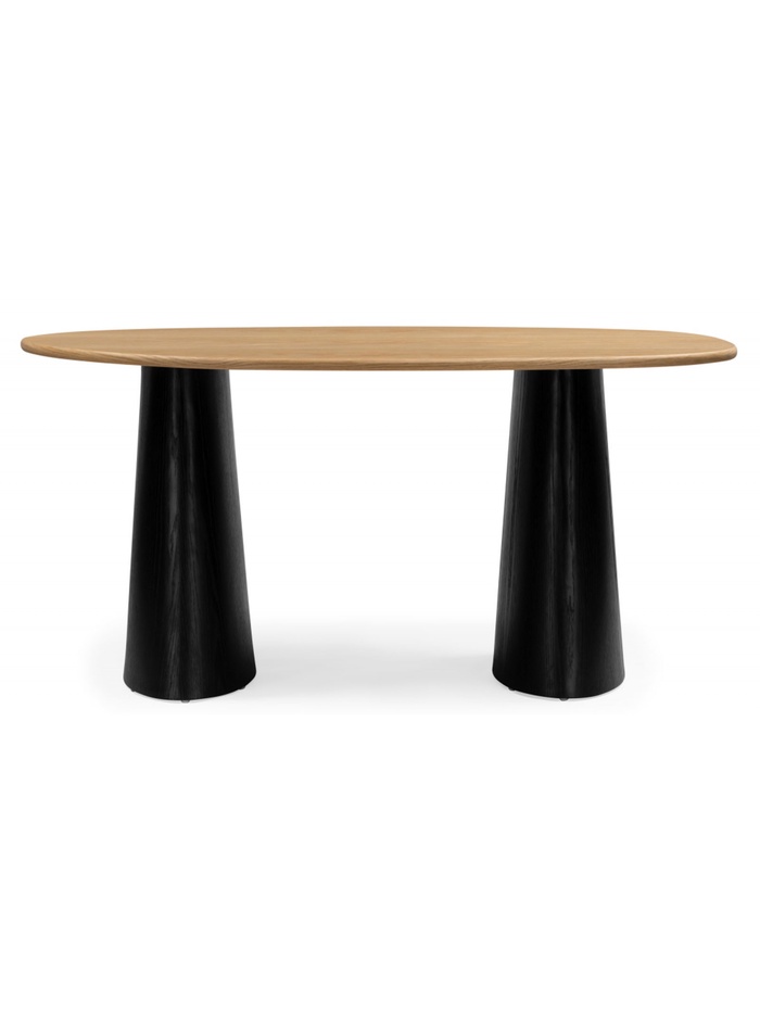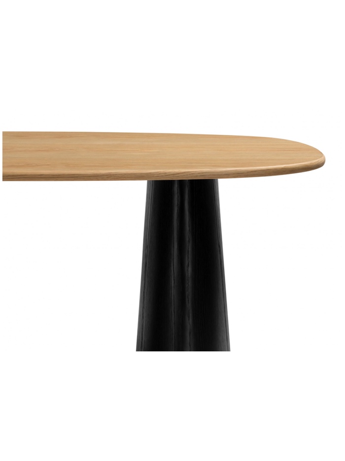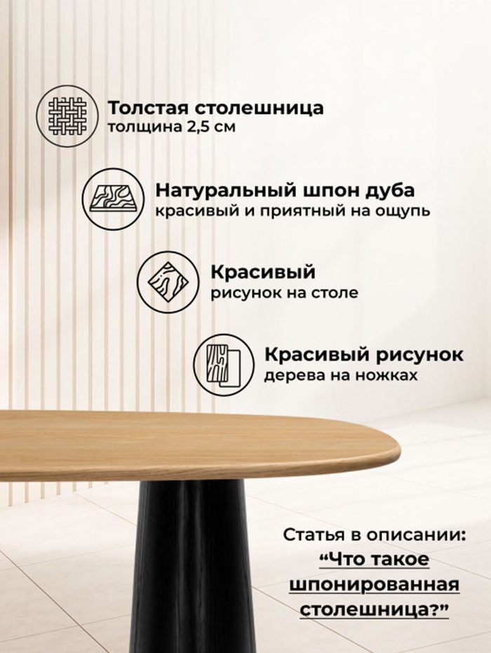 Элегантное и стильное решение для современной столовой или гостиной. Стол выполнен в благородном сочетании материалов и цветов: столешница из натурального шпона с текстурой дуба привносит в интерьер природную теплоту и уют, а массивные чёрные ножки из МДФ добавляют конструкции графичность и современный характер. Овальная форма столешницы смягчает геометрию помещения, создаёт уютную атмосферу и располагает к общению.