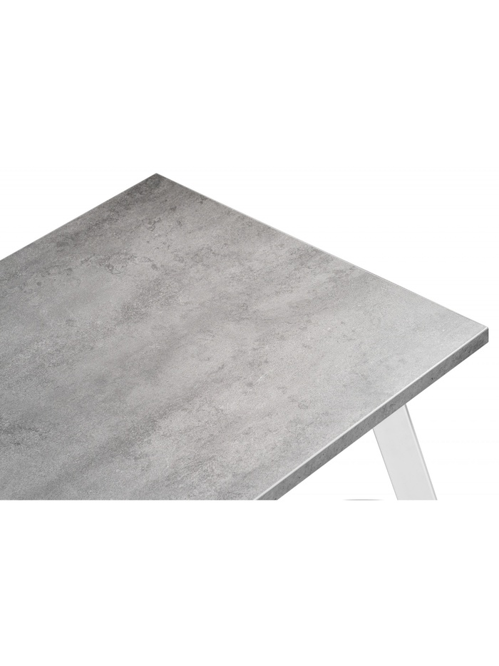 Современное и стильное решение для кухни или столовой в минималистичном интерьере. Стол выполнен в актуальном сочетании оттенков: столешница из ЛДСП с фактурой светлого бетона привносит в интерьер индустриальный характер и современную эстетику, а матовые белые металлические ножки добавляют конструкции лёгкость и графичность.