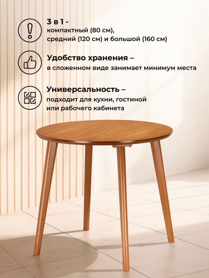 - Уютная атмосфера: круглая форма стола в сложенном виде создаёт ощущение равенства и располагает к непринуждённому общению во время семейных обедов.