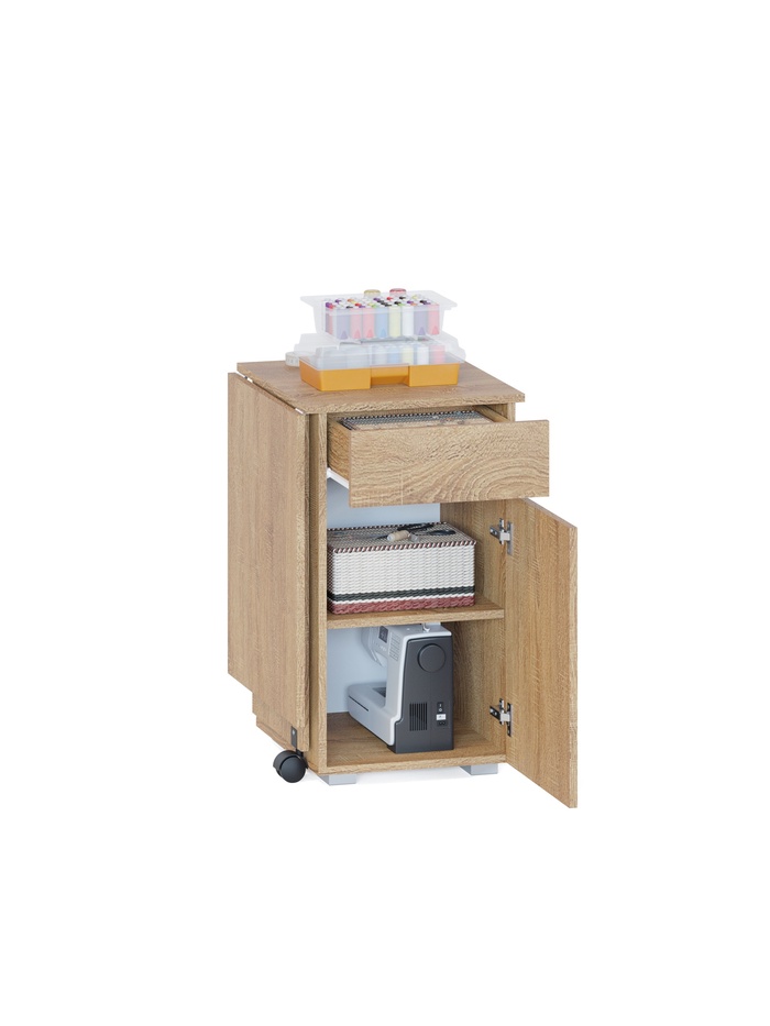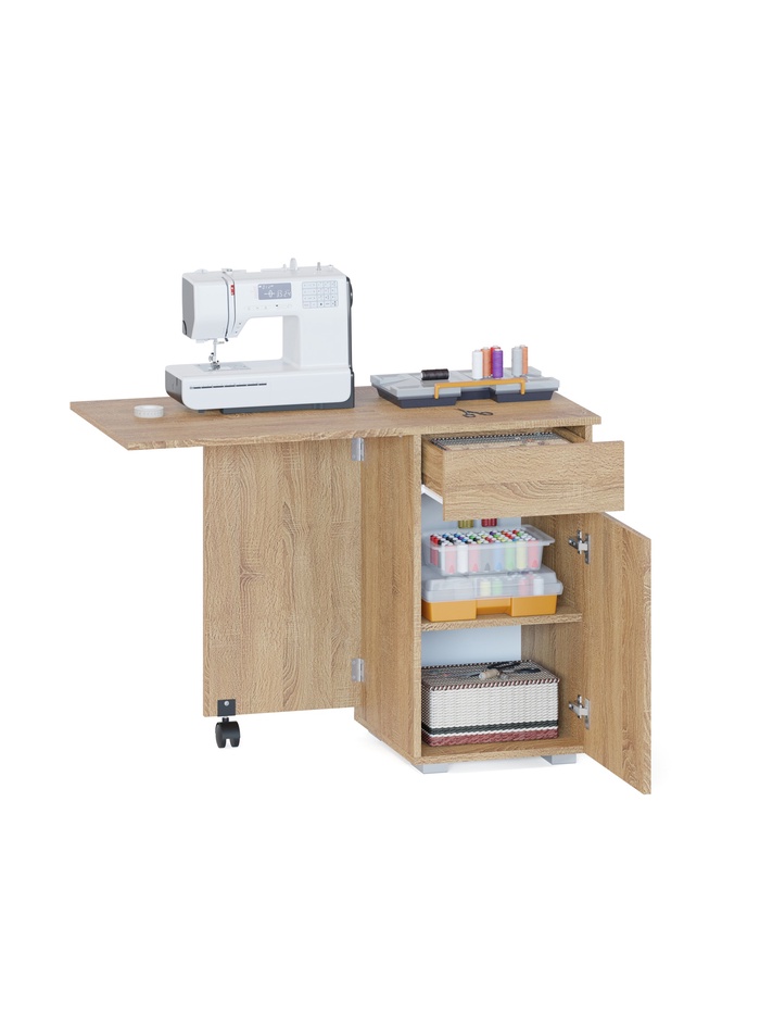 Стол универсален в использовании — его можно применять как письменный стол, рабочее место для ноутбука или стол для рукоделия. Например, швейную машинку удобно разместить на столешнице, а после работы убрать её внутрь тумбы.