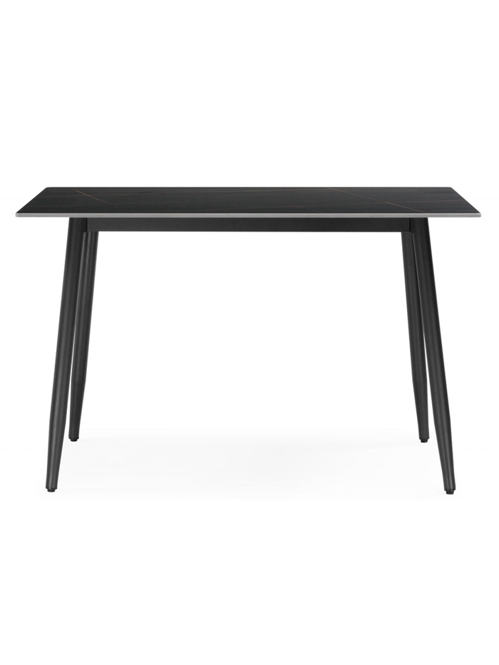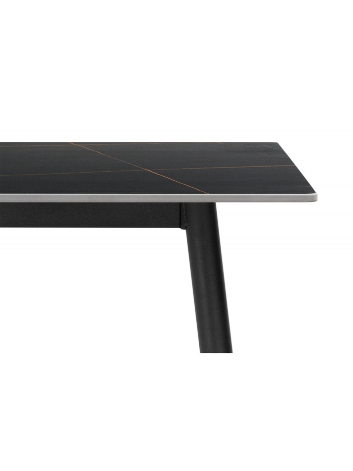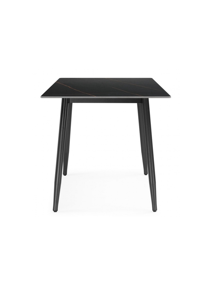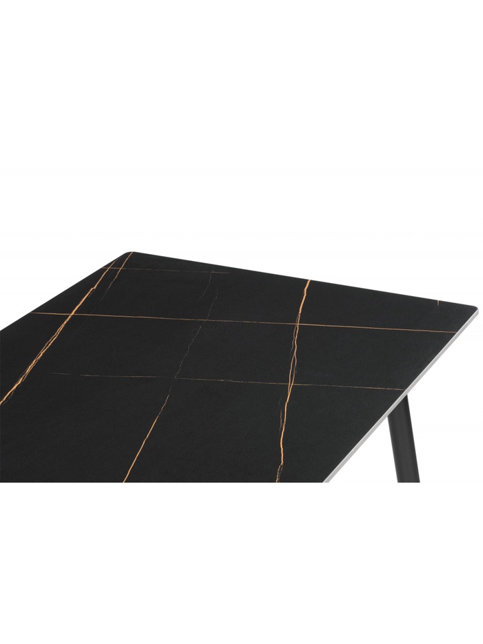 Роскошное и драматичное решение для современной кухни или столовой. Стол выполнен в благородном сочетании цветов: столешница из высококачественной керамики с эффектом чёрного мрамора и матовые чёрные металлические ножки создают монолитный и элегантный образ. Керамическая поверхность устойчива к царапинам, высоким температурам и загрязнениям, сохраняя безупречный вид на долгие годы.