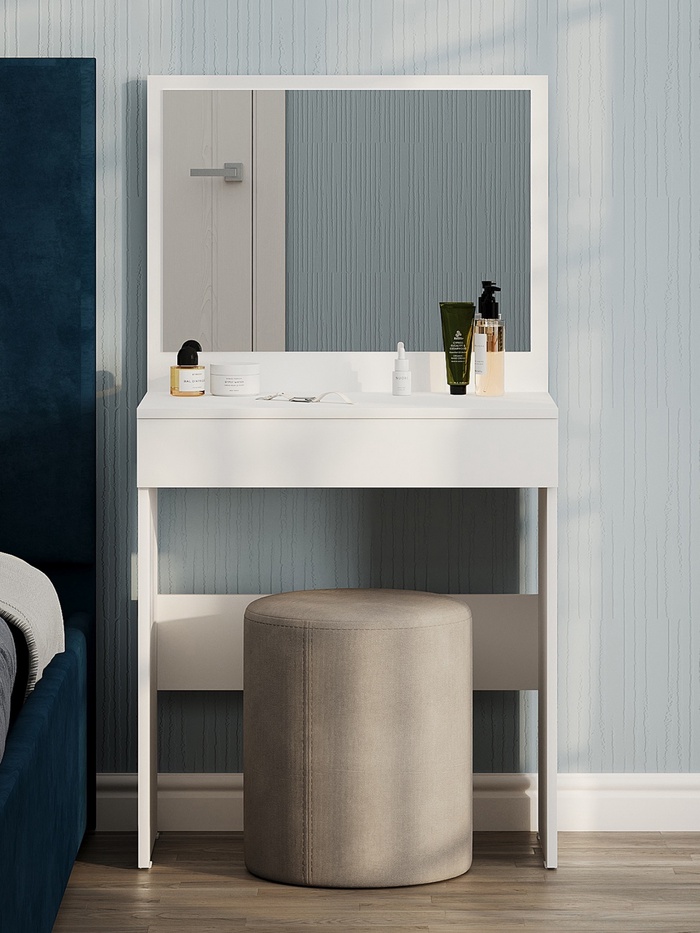 Элегантный туалетный стол сочетает функциональность и минималистичный дизайн, благодаря чему легко вписывается в различные интерьерные решения. Просторная столешница позволяет удобно разместить косметику, парфюмерию и необходимые аксессуары для ежедневного ухода.