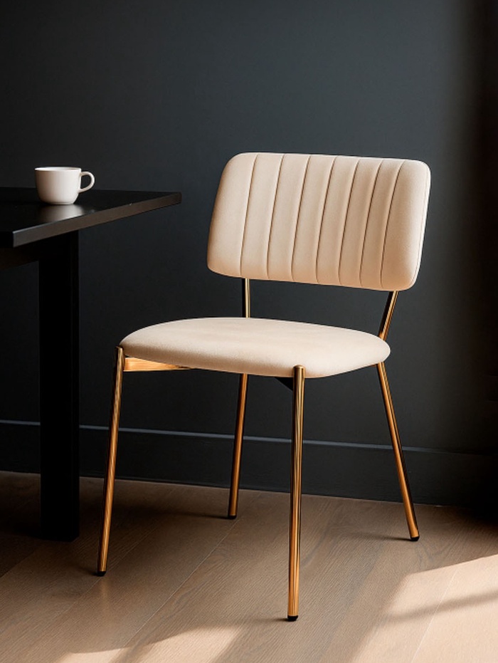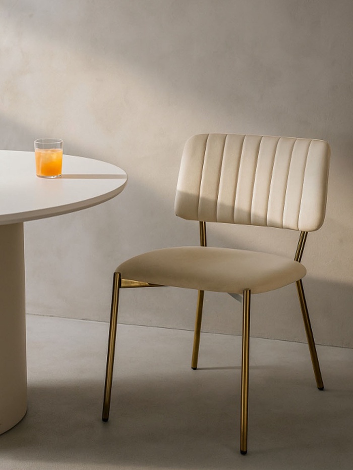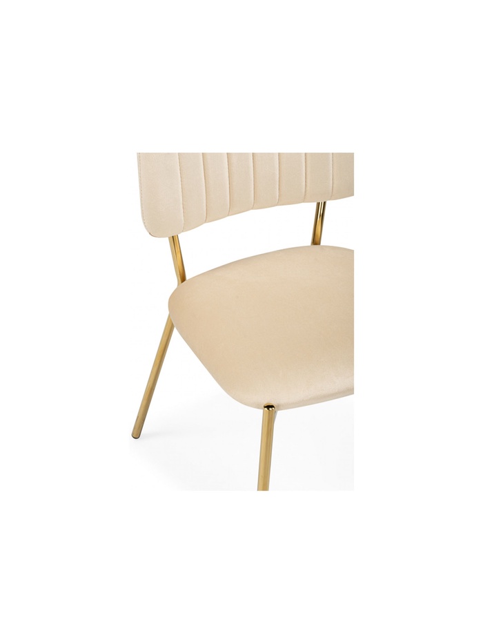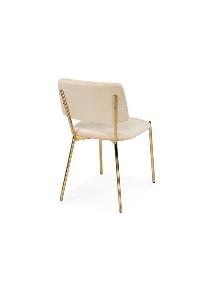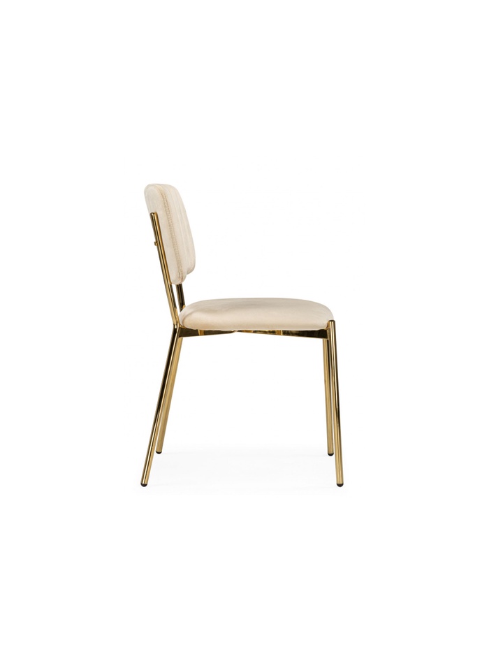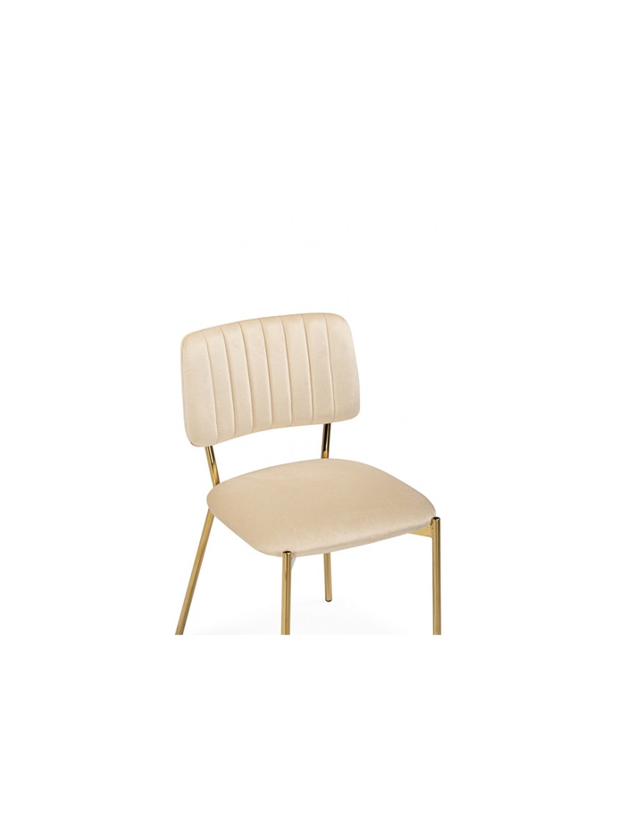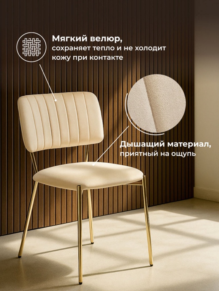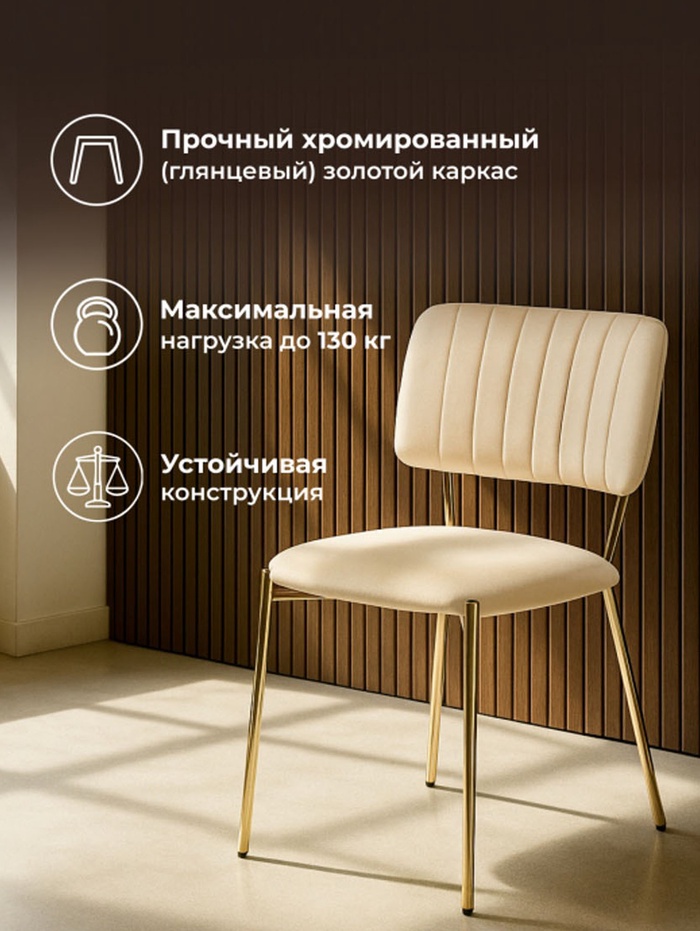 Роскошный и элегантный стул для кухни, столовой или гостиной. Модель выполнена в изысканном сочетании цветов: нежный бежевый велюр и благородный золотистый металлокаркас создают утончённый и торжественный образ, наполняющий интерьер теплом и светом. Надёжный металлический каркас обеспечивает повышенную устойчивость и долговечность, выдерживая нагрузку до 130 кг.