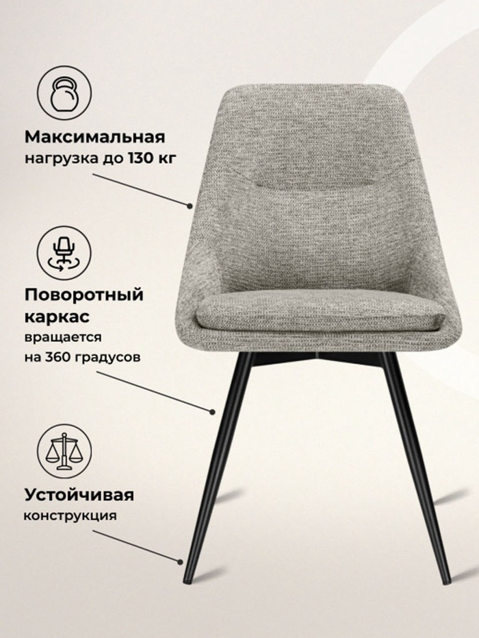 Современный и функциональный стул для кухни, столовой или гостиной. Модель выполнена в стильном сочетании цветов: благородный светло-серый и строгий чёрный создают элегантный монохромный образ, придающий интерьеру утончённость и современный характер. Стул оснащён поворотным механизмом, обеспечивающим удобство и свободу движений. Надёжный металлический каркас обеспечивает повышенную устойчивость и долговечность, выдерживая нагрузку до 130 кг.