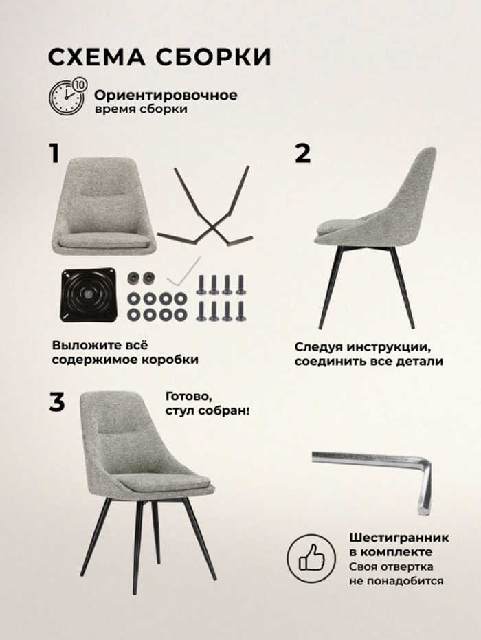 - Организация обеденной зоны: поворотный стул обеспечивает дополнительный комфорт во время обедов и общения.