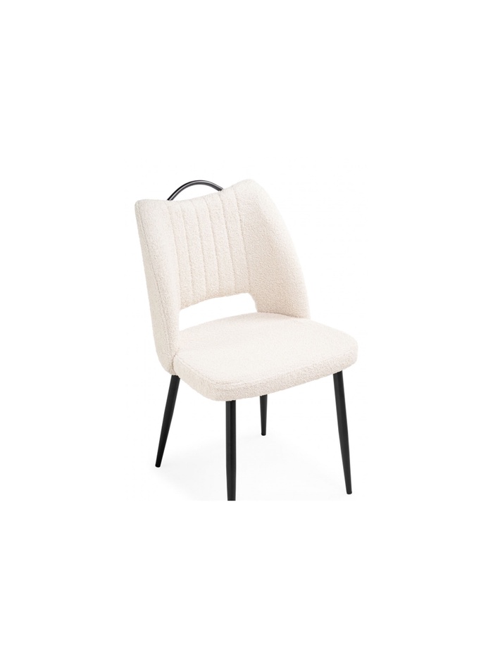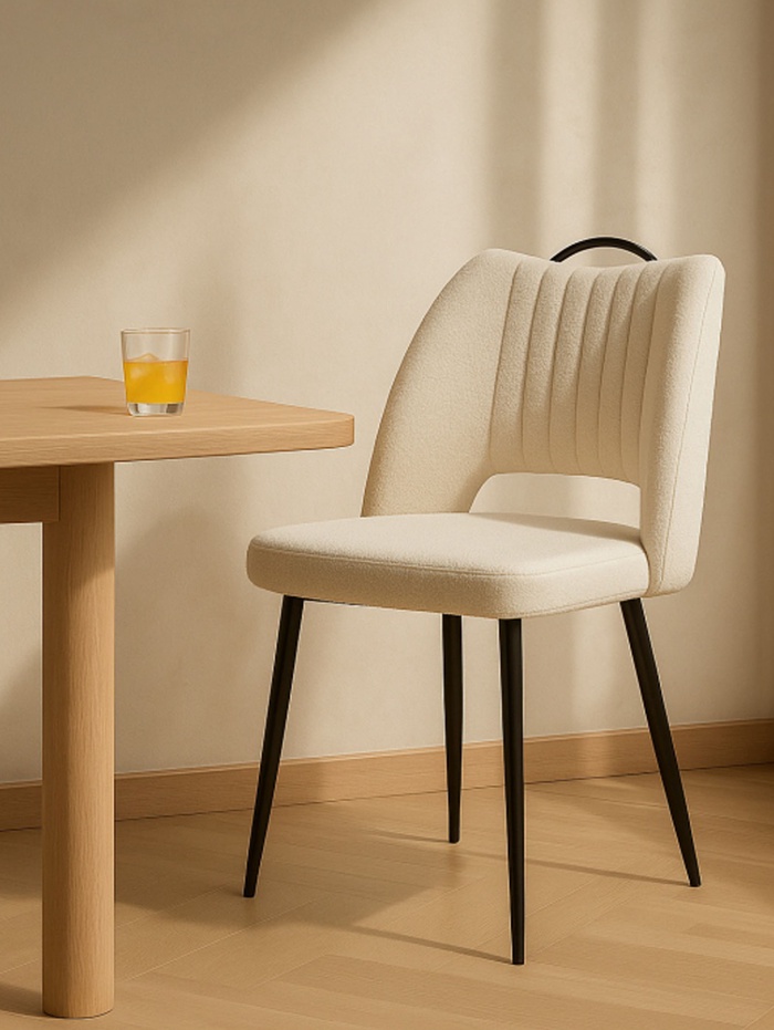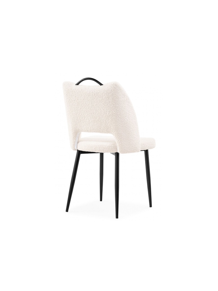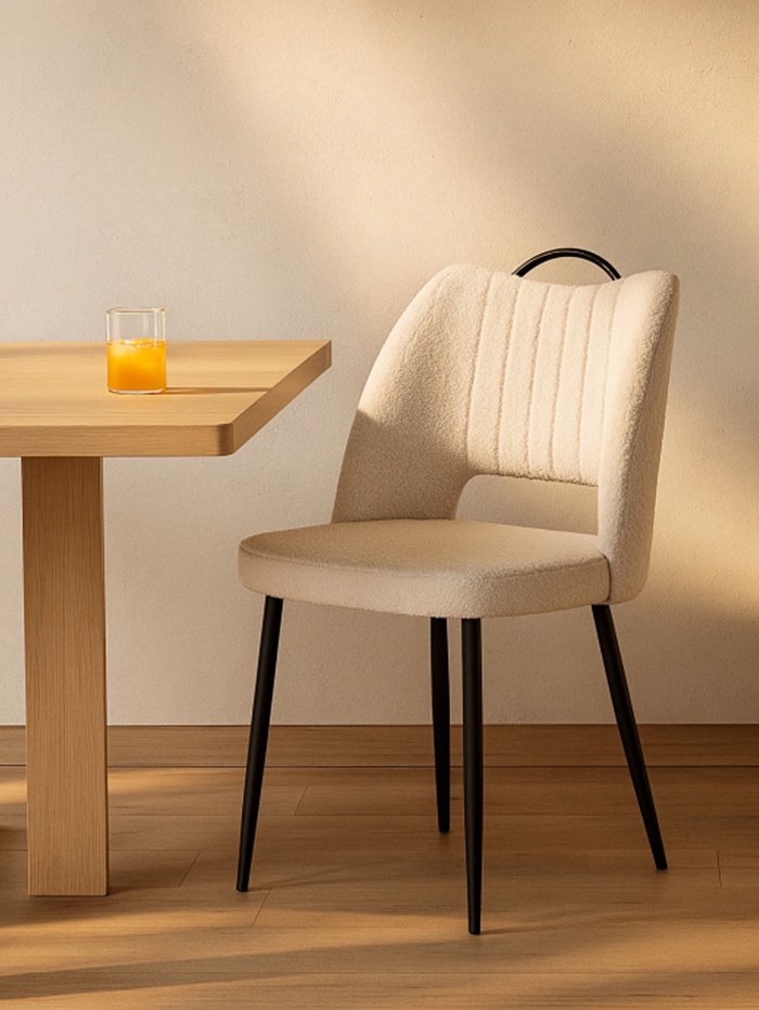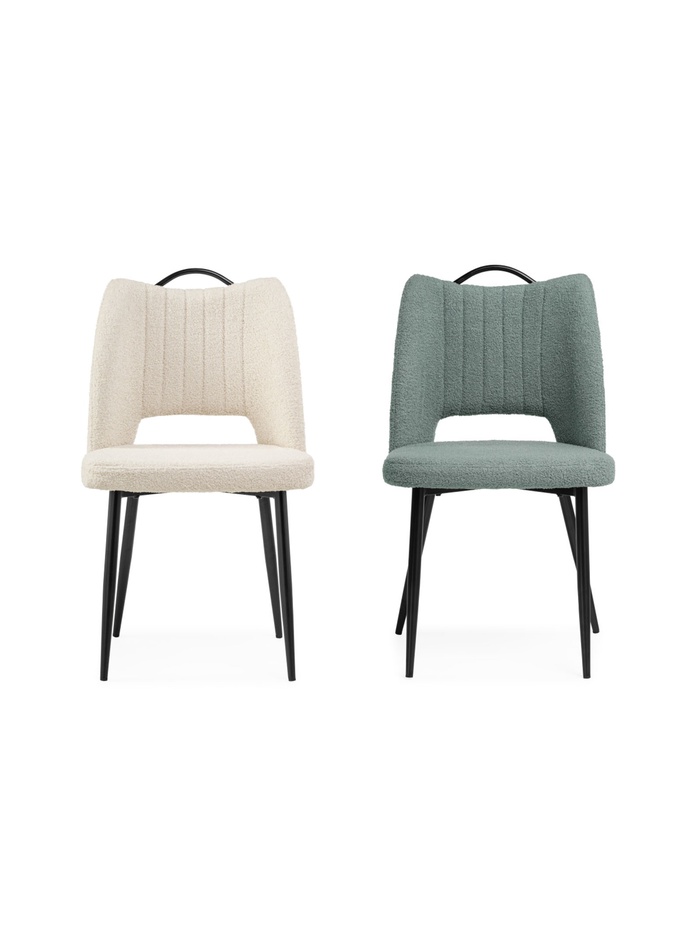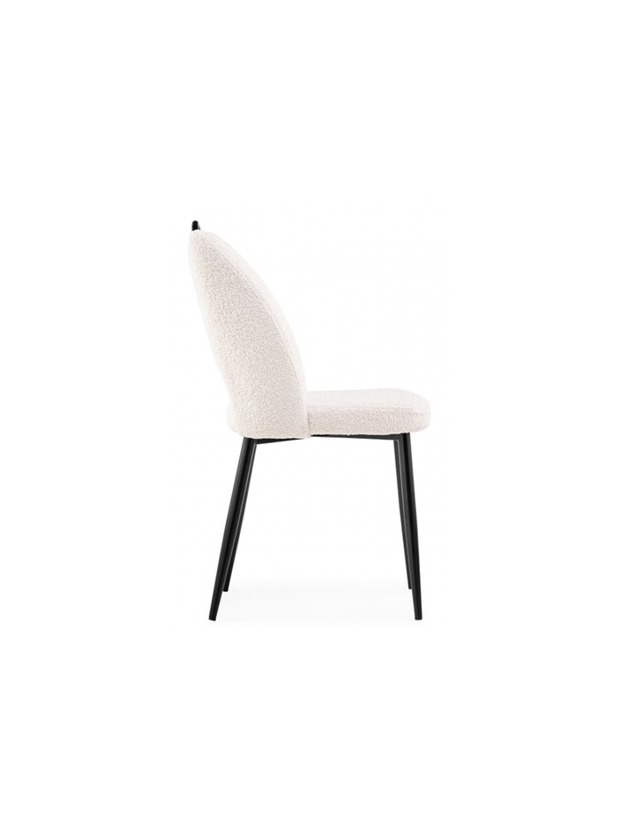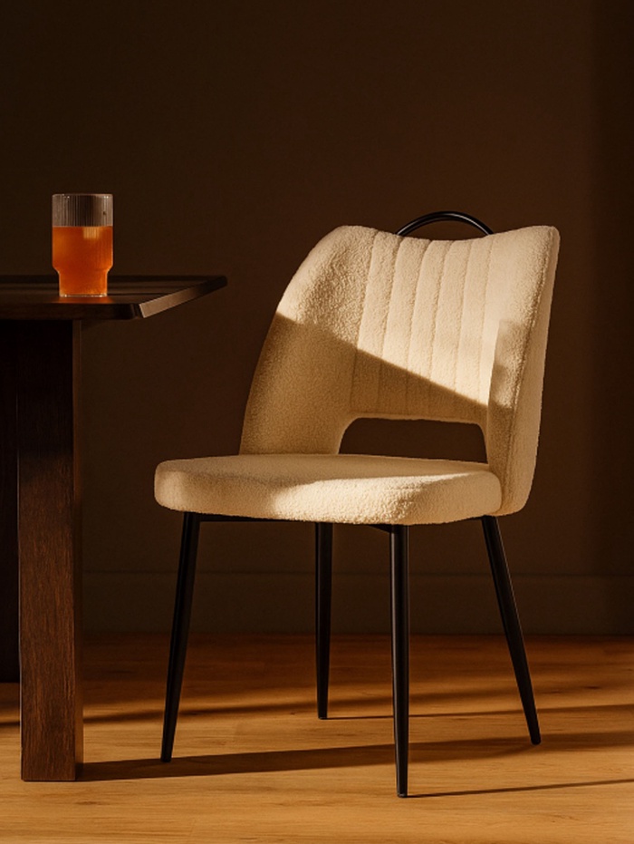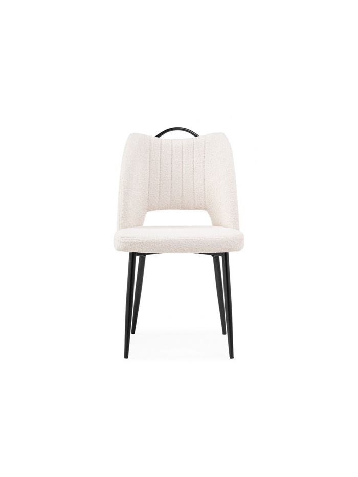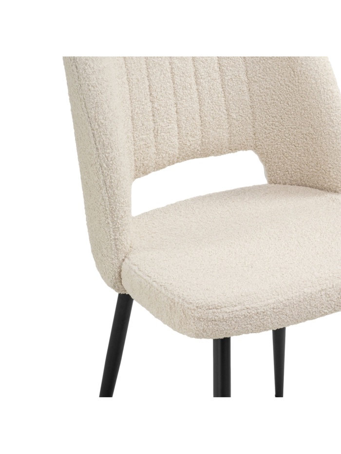 - Фактурная обивка: ткань букле придаёт стулу уютный и стильный вид, создавая интересную тактильную поверхность.