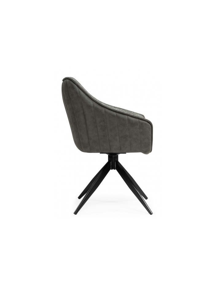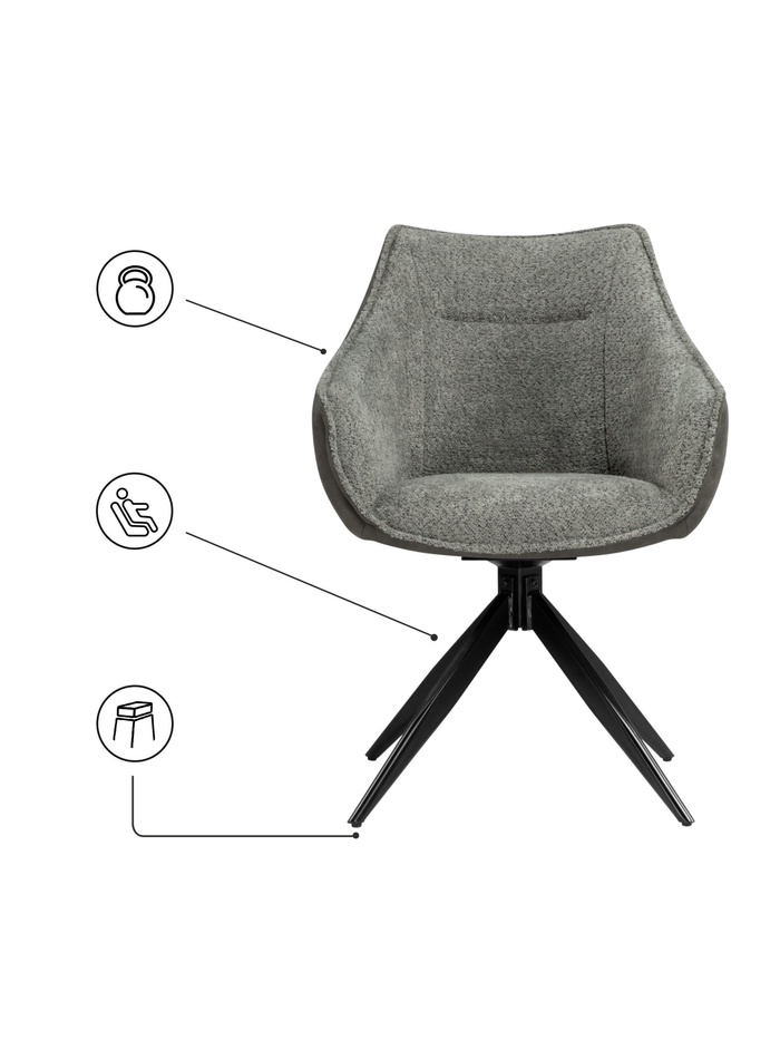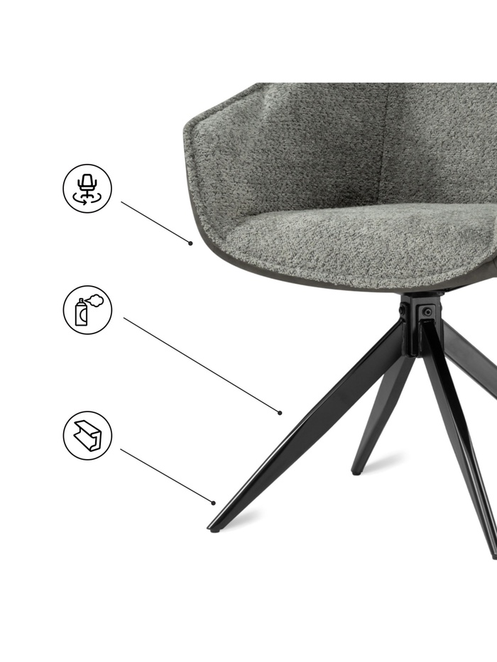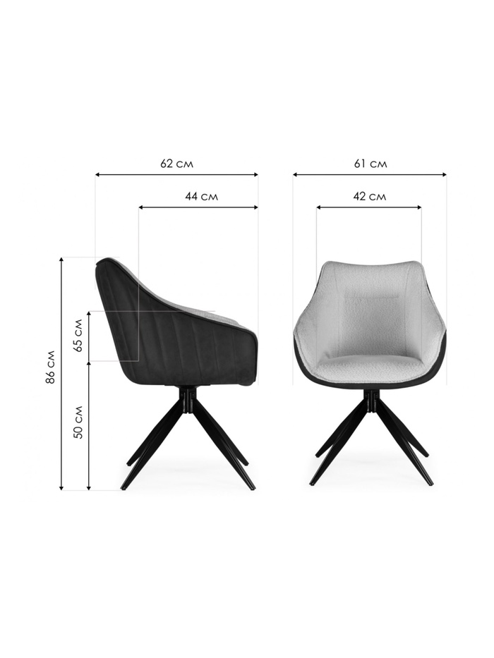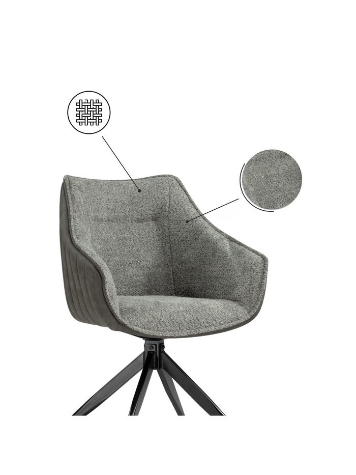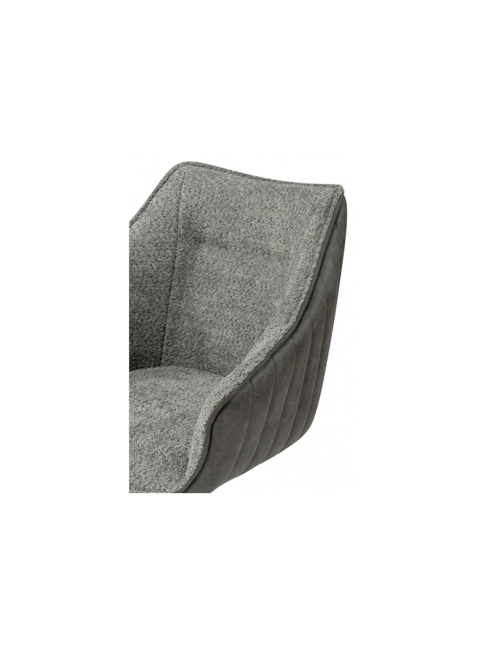 Современный и стильный стул для кухни, столовой или гостиной. Модель выполнена в элегантной монохромной гамме: благородный серый, глубокий графит и строгий чёрный создают утончённый и сдержанный образ, придающий интерьеру современный характер. Комбинированная обивка сочетает в себе фактурный букле и практичный искусственный нубук, что придаёт стулу изысканный вид и обеспечивает комфорт. Надёжный металлический каркас обеспечивает устойчивость и долговечность, выдерживая нагрузку до 100 кг.