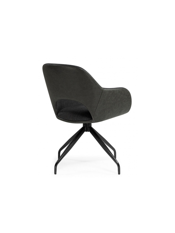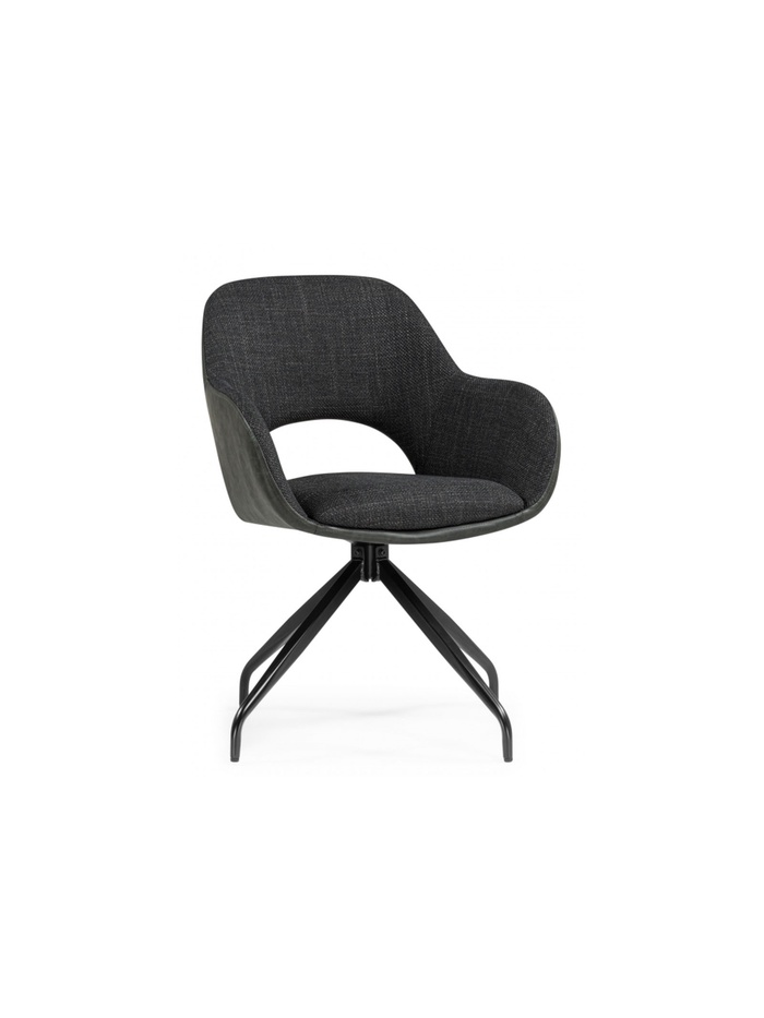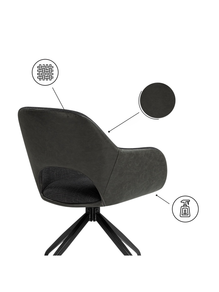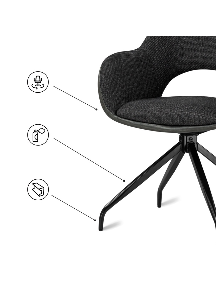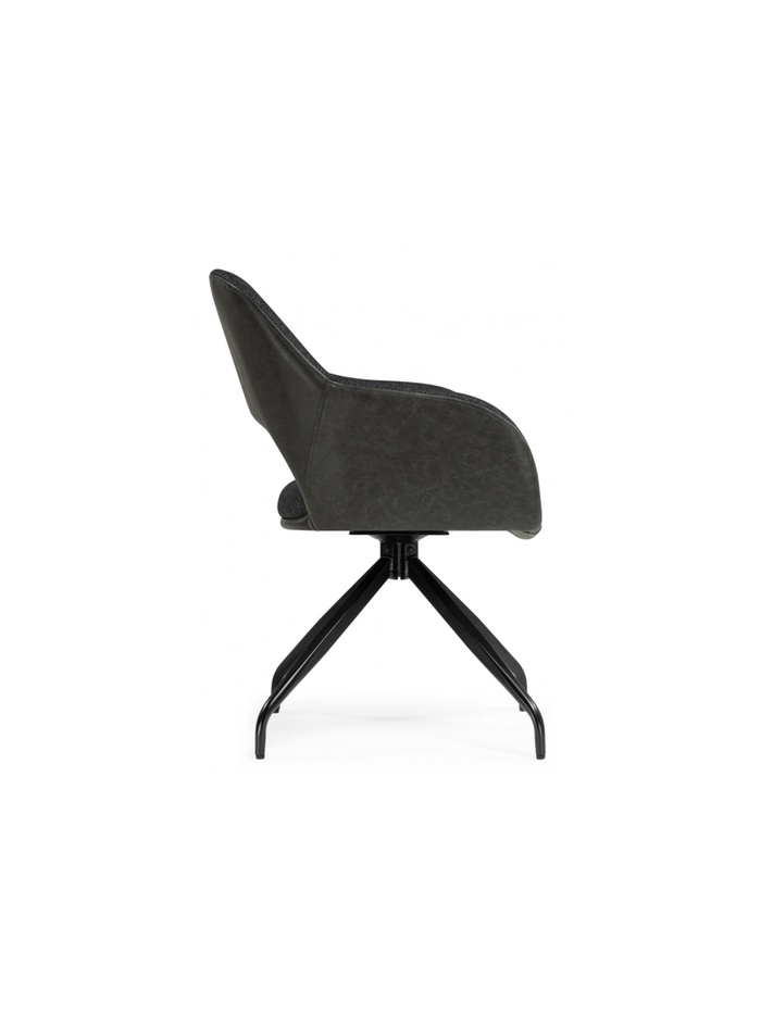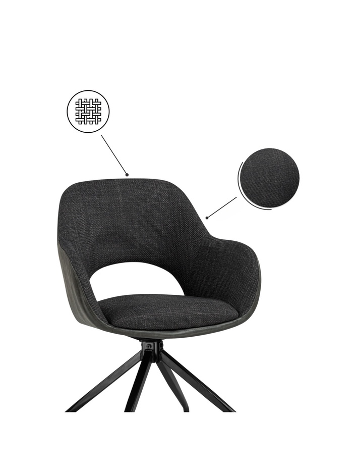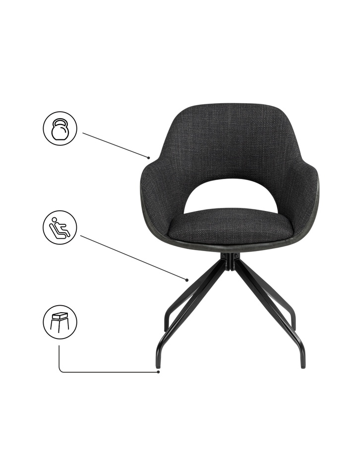 Современный и функциональный стул для кухни, столовой или гостиной. Модель выполнена в стильной монохромной гамме: глубокий графит и строгий чёрный создают элегантный и сдержанный образ, придающий интерьеру современный характер. Стул оснащён поворотным механизмом, обеспечивающим удобство и свободу движений. Надёжный металлический каркас обеспечивает устойчивость и долговечность, выдерживая нагрузку до 100 кг.