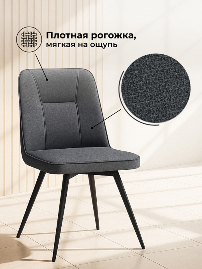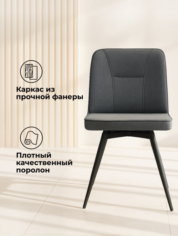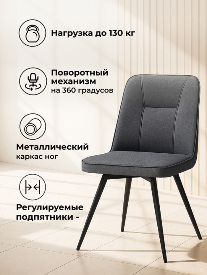Современный и функциональный стул для кухни, столовой или гостиной. Модель выполнена в стильной монохромной гамме: глубокий тёмно-серый и строгий чёрный создают элегантный и сдержанный образ, придающий интерьеру современный характер. Стул оснащён поворотным механизмом, обеспечивающим удобство и свободу движений. Надёжный металлический каркас обеспечивает повышенную устойчивость и долговечность, выдерживая нагрузку до 130 кг.