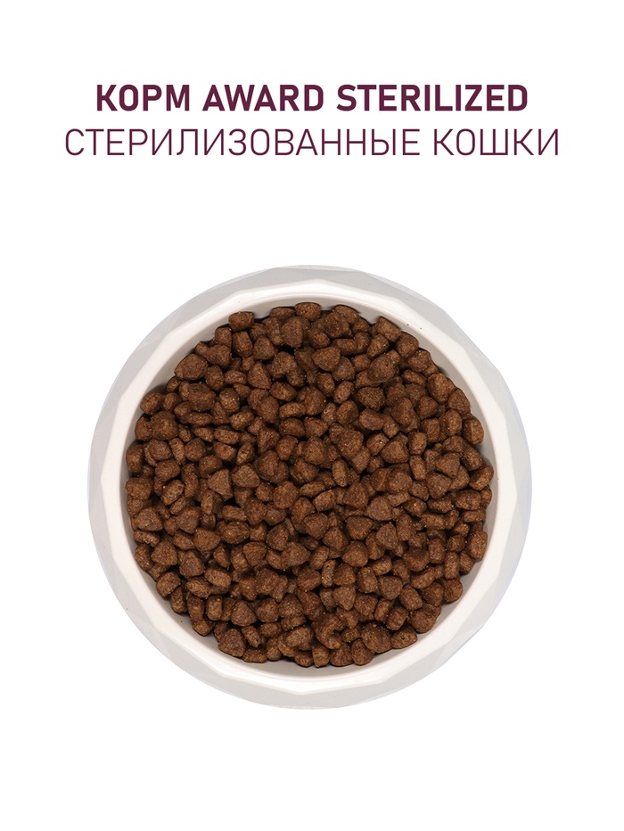 Профилактика и забота: Корм учитывает особенности метаболизма стерилизованных кошек. Храните при температуре от +1°C до +30°C. AWARD Sterilized — сбалансированный выбор для поддержания здоровья вашего питомца после операции.