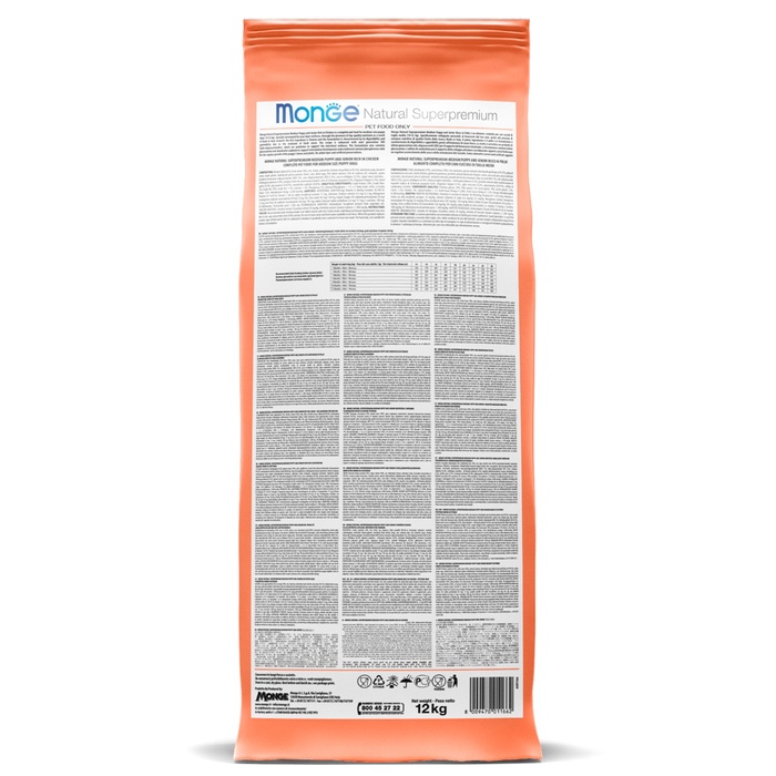Технические характеристики Сухой корм Monge Dog Speciality Puppy&Junior для щенков всех пород, лосось/рис, 12 кг