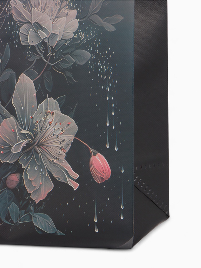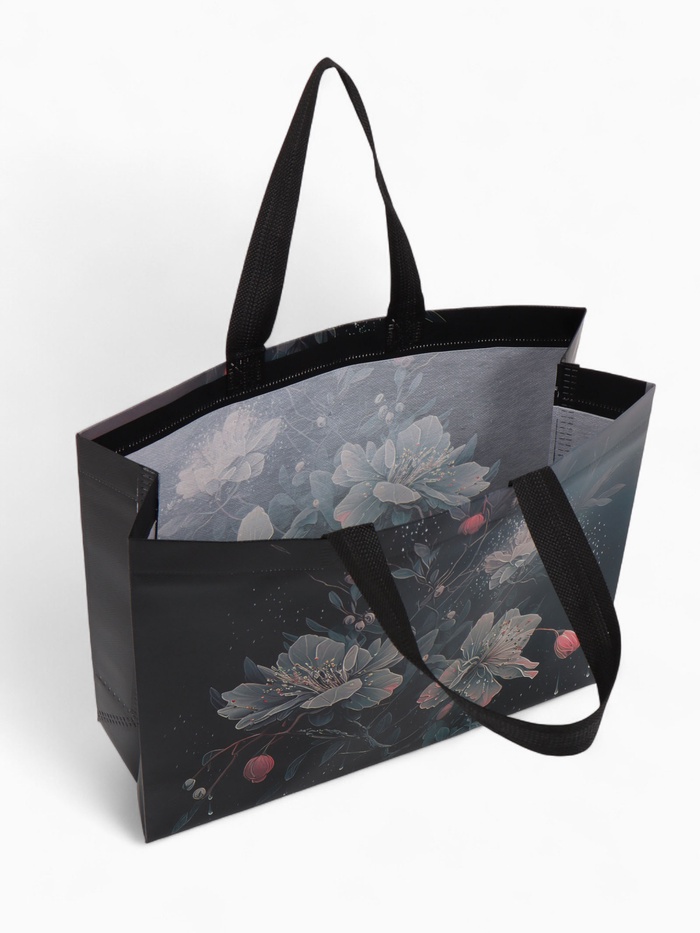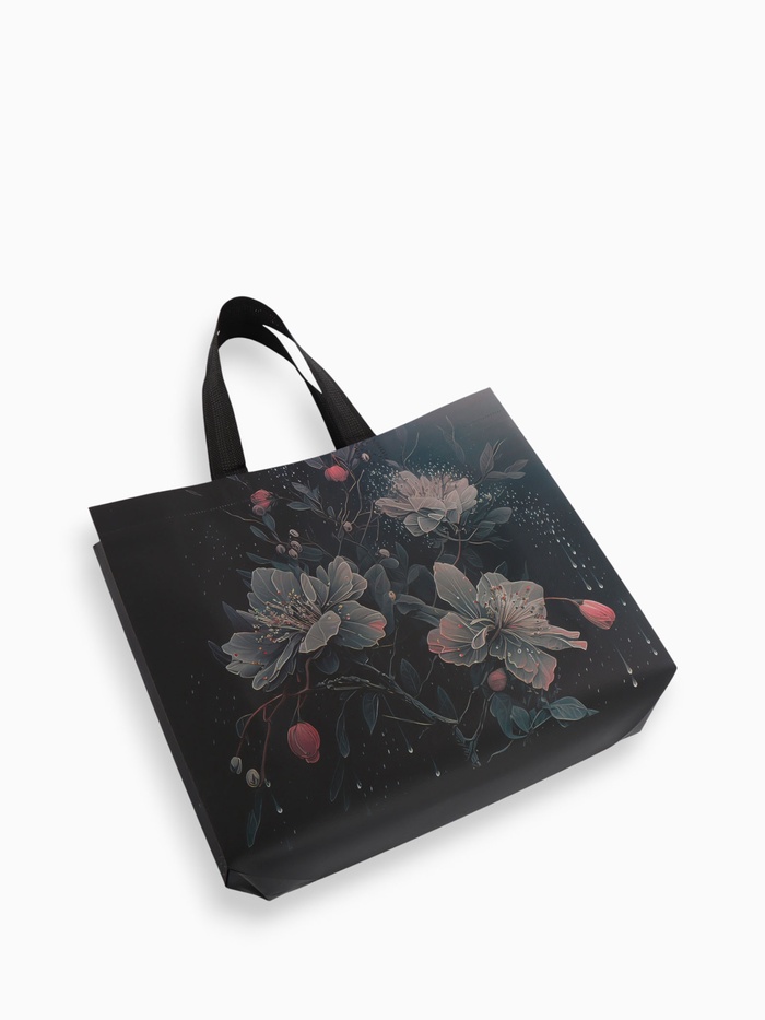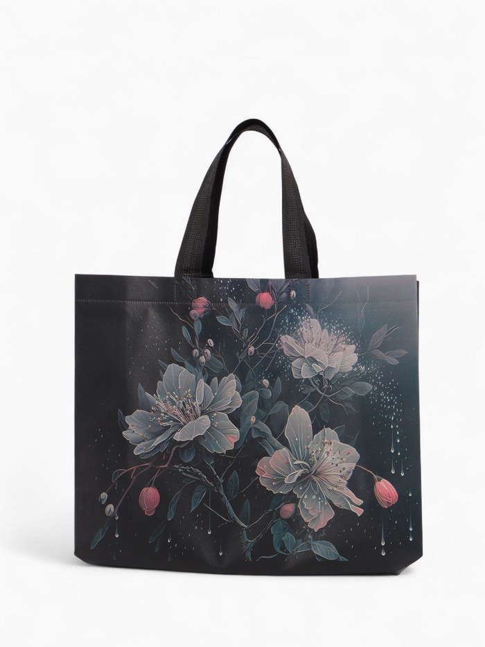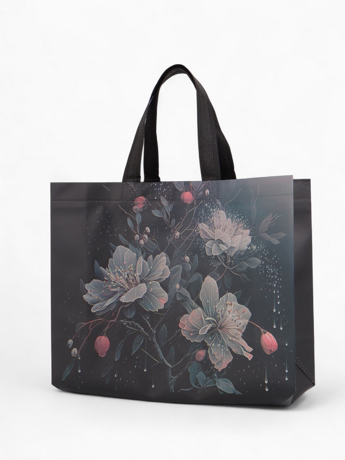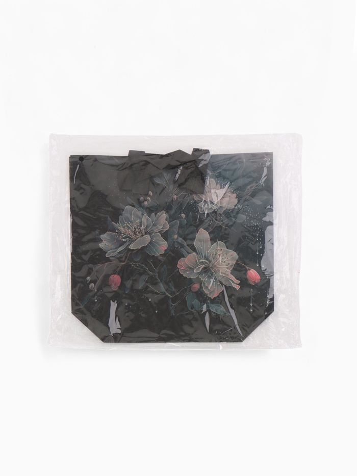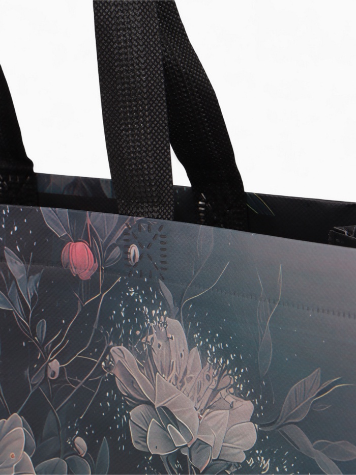 Чёрный шопер с цветочным принтом сочетает в себе практичность и выразительный стиль. Эта модель подходит для тех, кто ценит универсальность в повседневных аксессуарах.