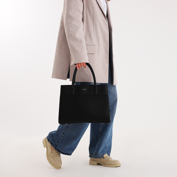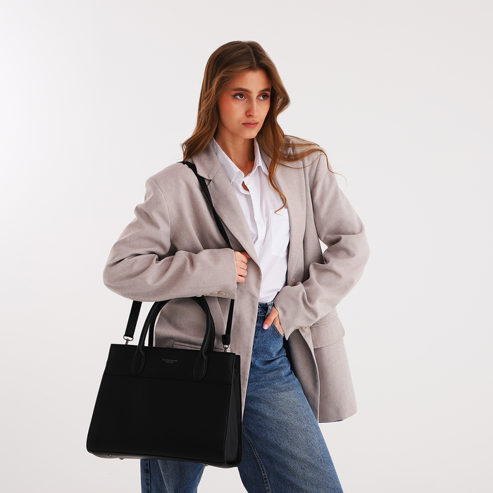 Черная кожаная сумка-тоут создает основу для повседневного образа. Жесткий каркас сохраняет форму, а регулируемый ремень предлагает несколько вариантов ношения.