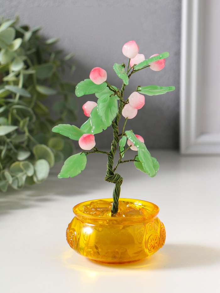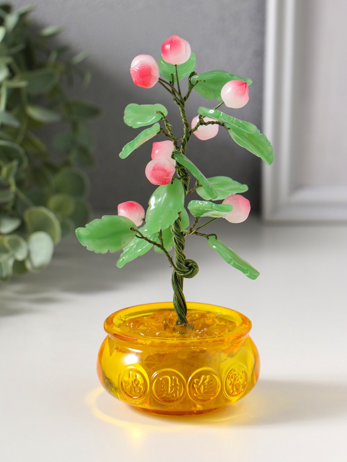 Этот декоративный бонсай с персиками — символ процветания и долголетия, готовый привнести энергию изобилия в ваш дом или офис. Композиция в чаше богатства создаёт законченный образ гармонии и благополучия, становясь значимым подарком или личным талисманом.