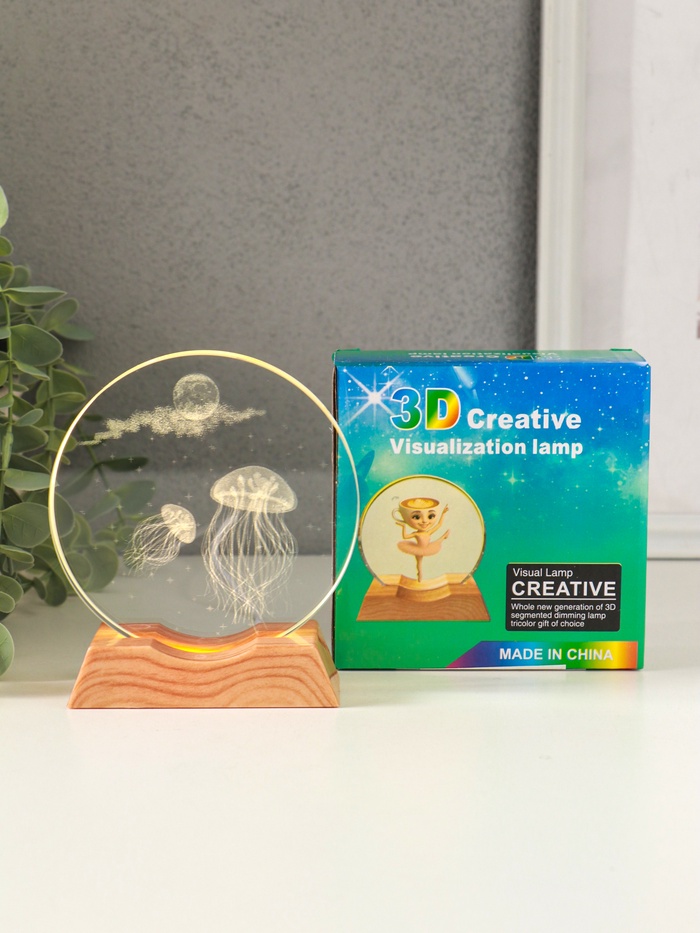 Световая фигурка стекло «Диск. Голограмма: Медузы», 5×LED, d=10 см, USB, 10×4×11.4 см