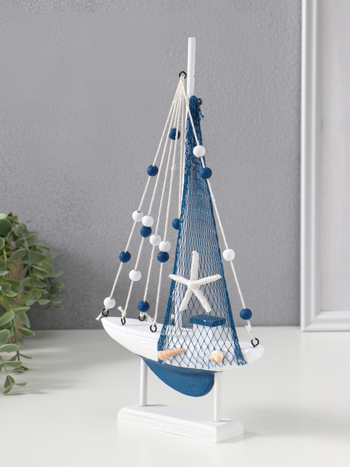 Сувенирная модель корабля дерево «Парусник с морской звездой на парусе», бело-синий, 17.5×4×31 см