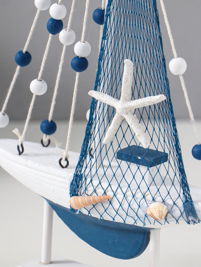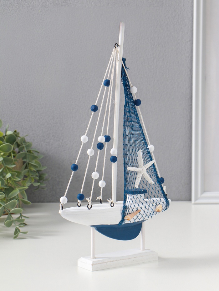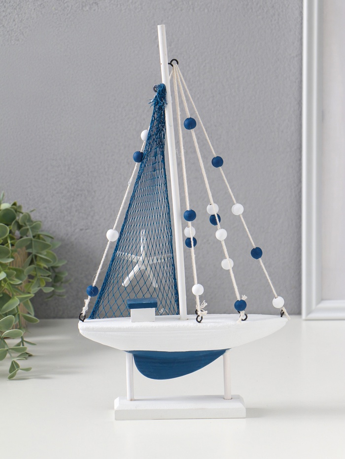Эта бело-синяя модель парусника — не просто сувенир, а частица морской романтики, застывшая в дереве. Она напоминает о ветре, наполняющем паруса, и далёких горизонтах. Средний размер делает модель заметным акцентом в кабинете или гостиной, не загромождая пространство. Тщательная работа видна в каждой детали: от изящных снастей до узнаваемого символа морской звезды на парусе.