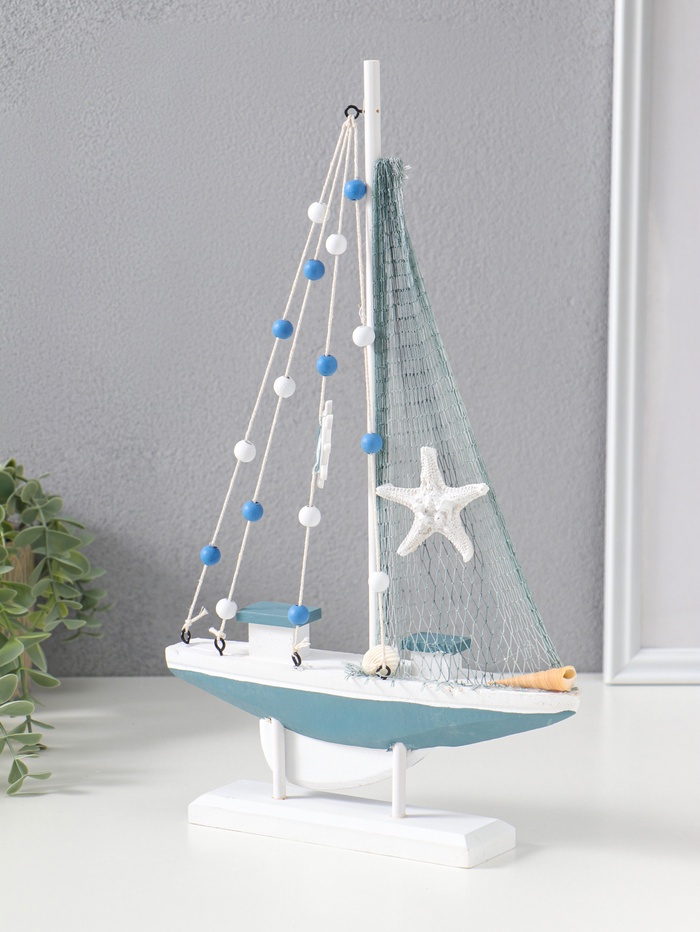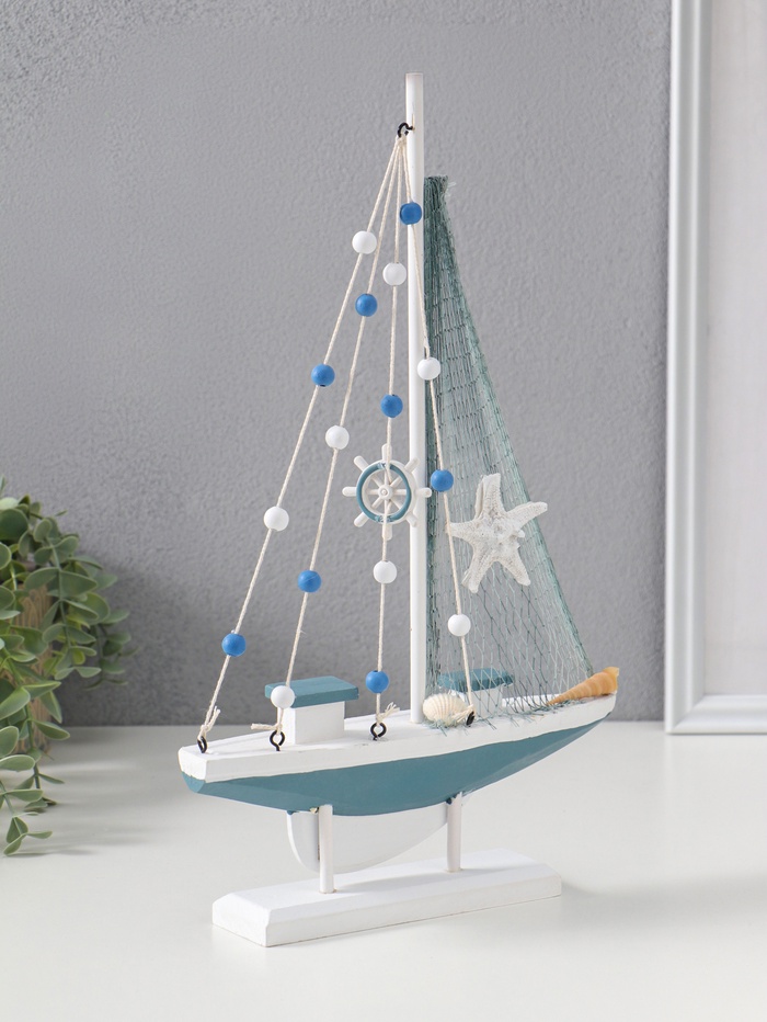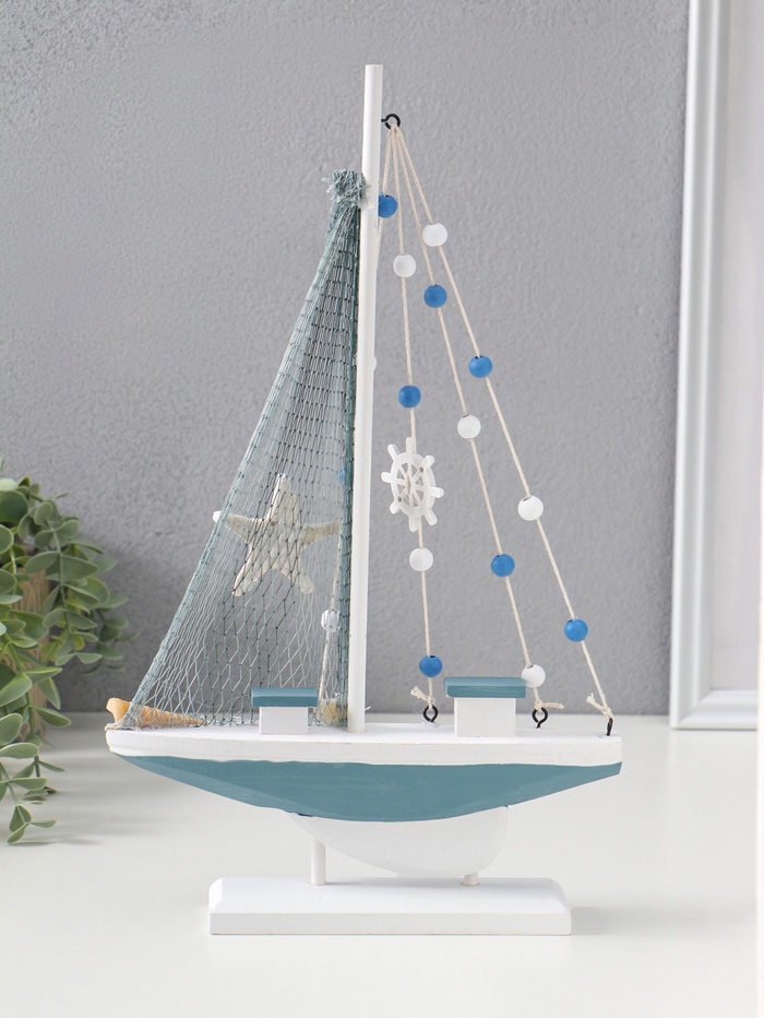 Сувенирная модель корабля дерево «Парусник с якорем и морской звездой», бело-голубой, 21.5×4.5×36 см