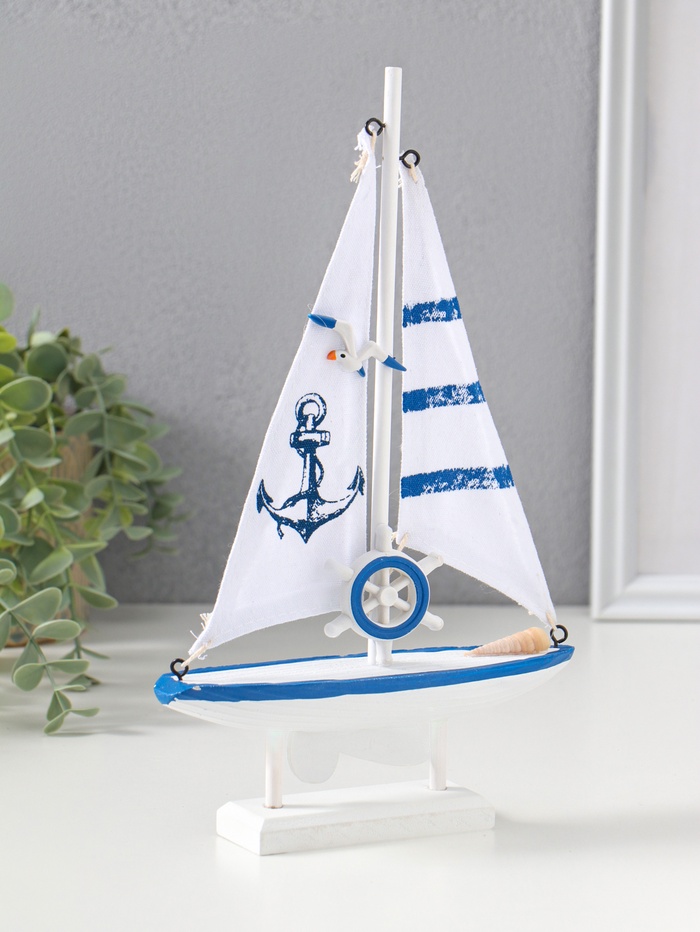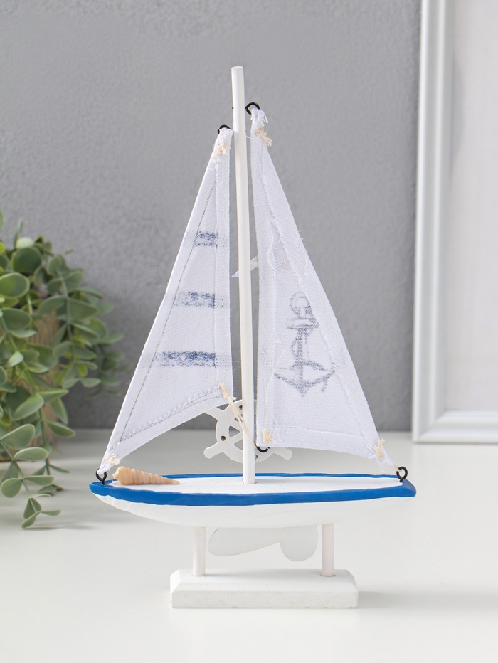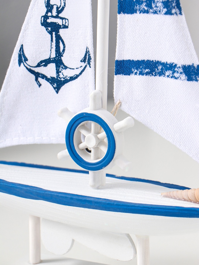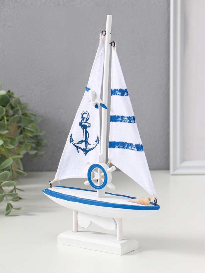 Сувенирная модель корабля дерево «Парусник с якорем на парусе», бело-синий, 16.5×4.5×27.5 см