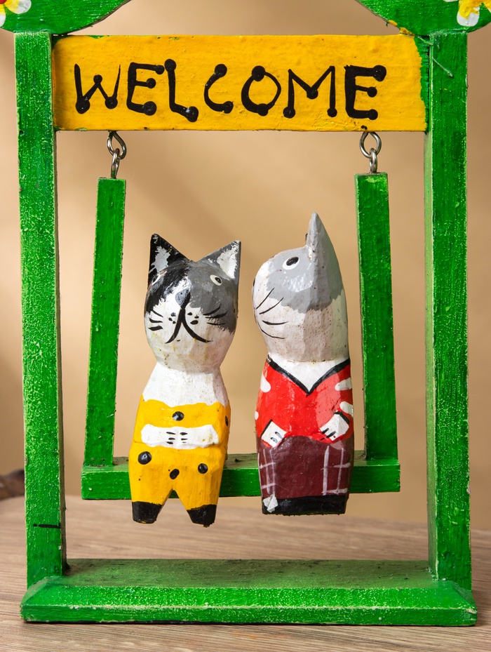 Интерьерная композиция «Кошечки на качелях» — трогательная сцена из дерева, раскрашенная в мягкие разноцветные тона. Высота 25 см делает её заметной, но не доминирующей: она легко вписывается на полку, подоконник или домашний уголок уюта, добавляя пространству лёгкости и доброты.