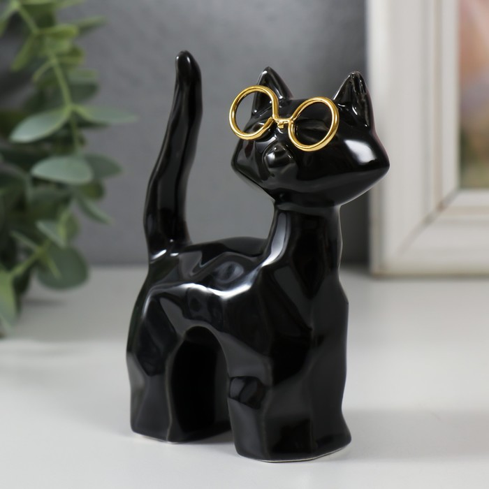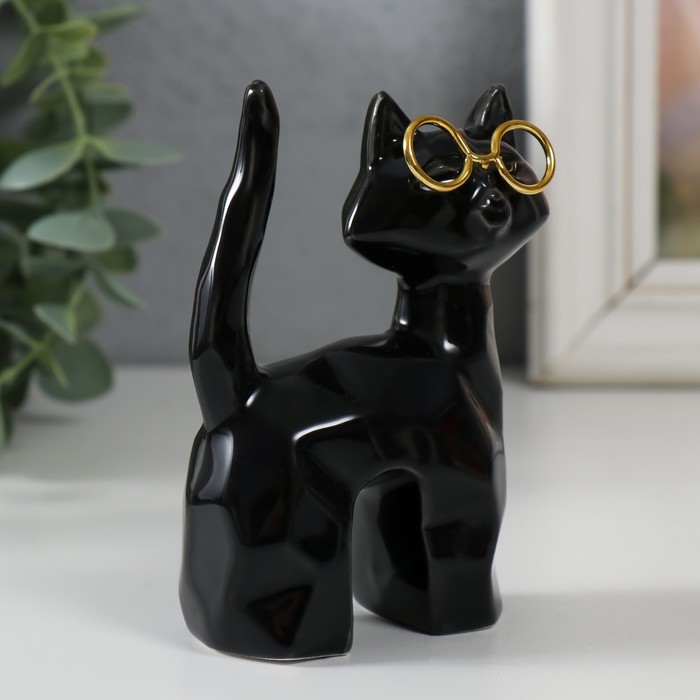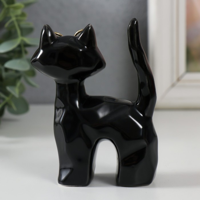 Фигурка керамика «Чёрный котик в очках, хвост трубой», грани, подставка для колец, 8×3.5×10.3 см
