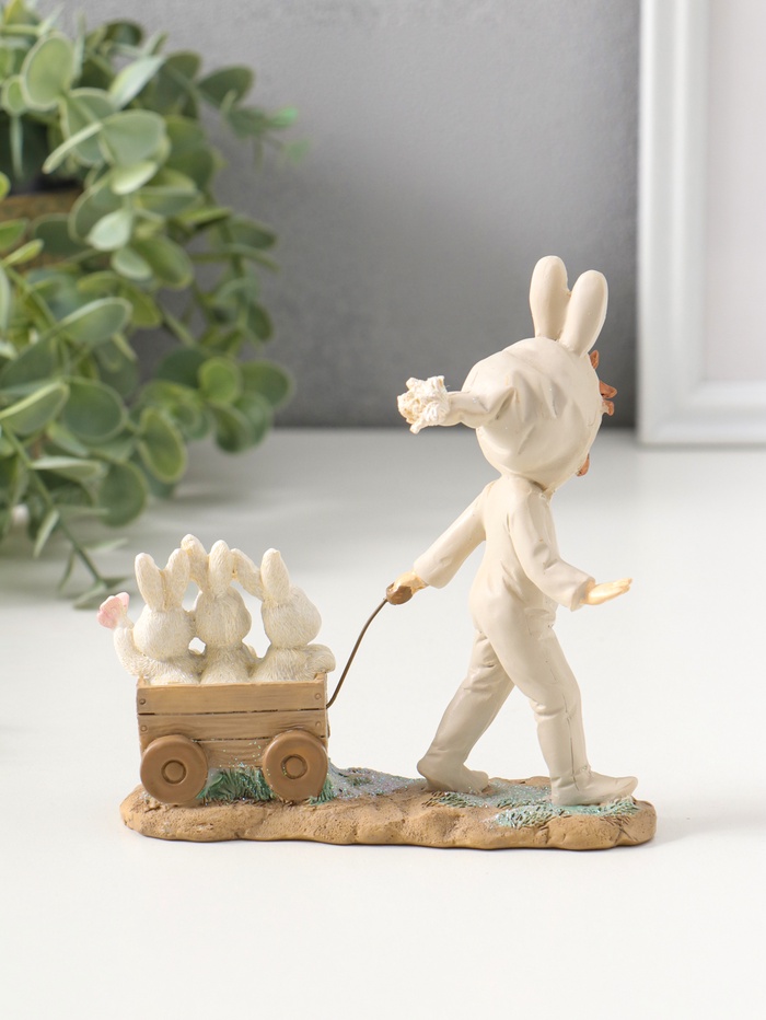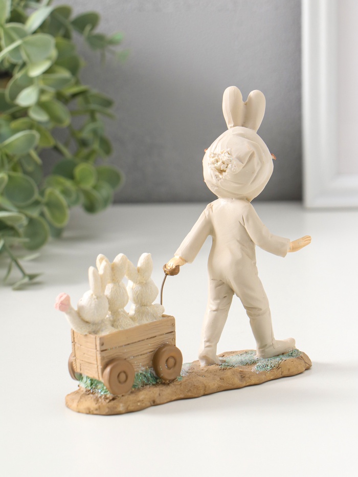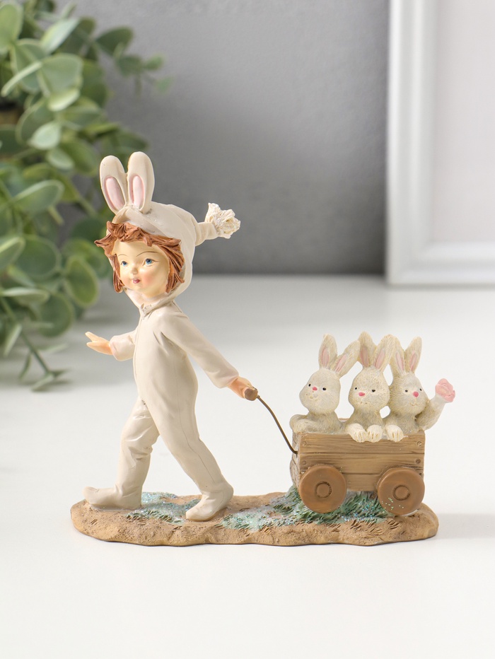 Фигурка полистоун «Девочка в комбинезоне с заячьими ушами, везет тележку с зайцами», 13.5 см