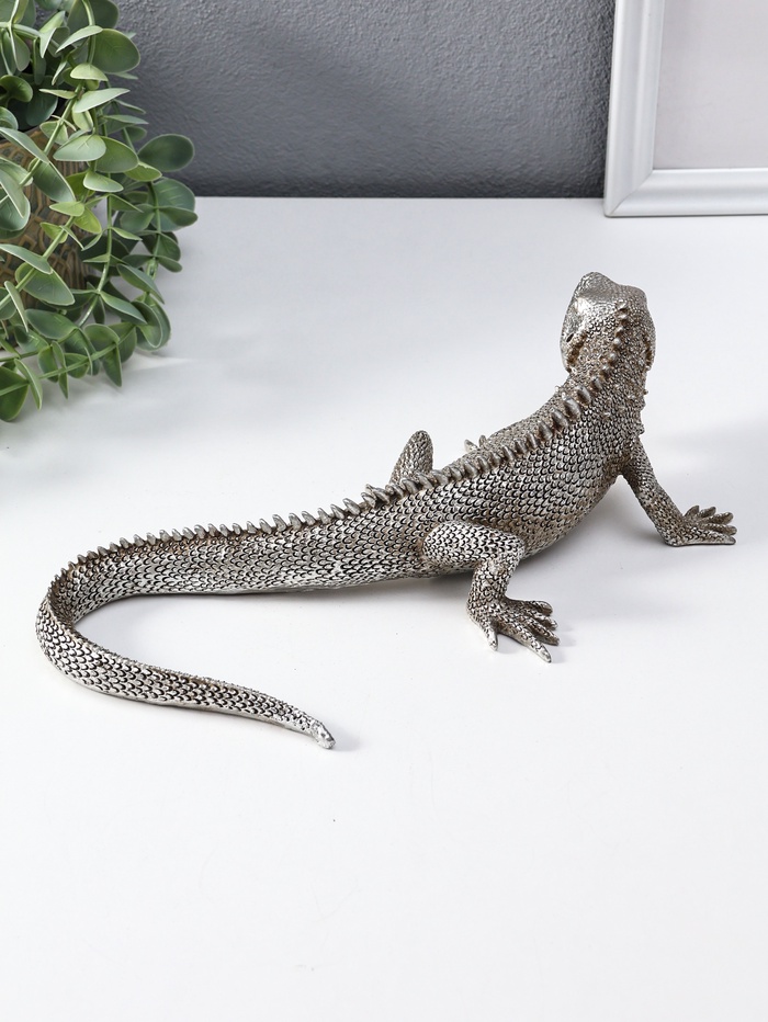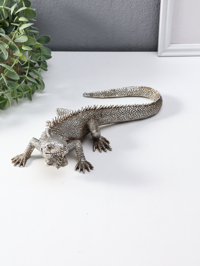 Эта скульптура игуаны из полистоуна — не просто статуэтка, а выразительный арт-объект для вашего интерьера. Холодный блеск чернёного серебра и детальная проработка чешуи создают ощущение, будто перед вами замер древний дух из металла и камня. Компактный размер делает её идеальным акцентом для книжной полки, рабочего стола или каминной полки, добавляя пространству загадочности и стиля.