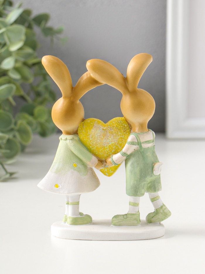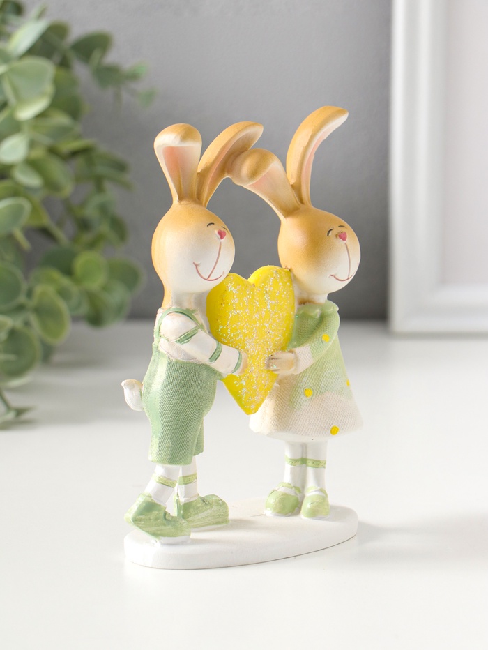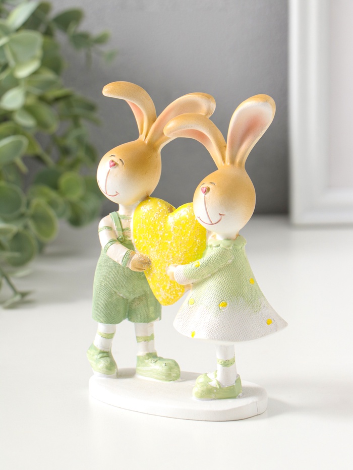 Фигурка полистоун «Зайки-малыши в зелёных нарядах, с большим жёлтым сердцем», 13.5 см