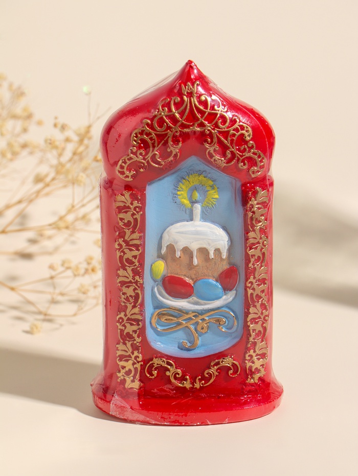 Эта пасхальная свеча создаёт тёплую и радостную атмосферу праздника. Фигурный кулич с яркой глазурью и праздничный красный цвет делают её центром пасхального стола или душевным подарком для близких. Свеча горит ровно и долго, наполняя дом особым, светлым настроением Светлого Воскресения.