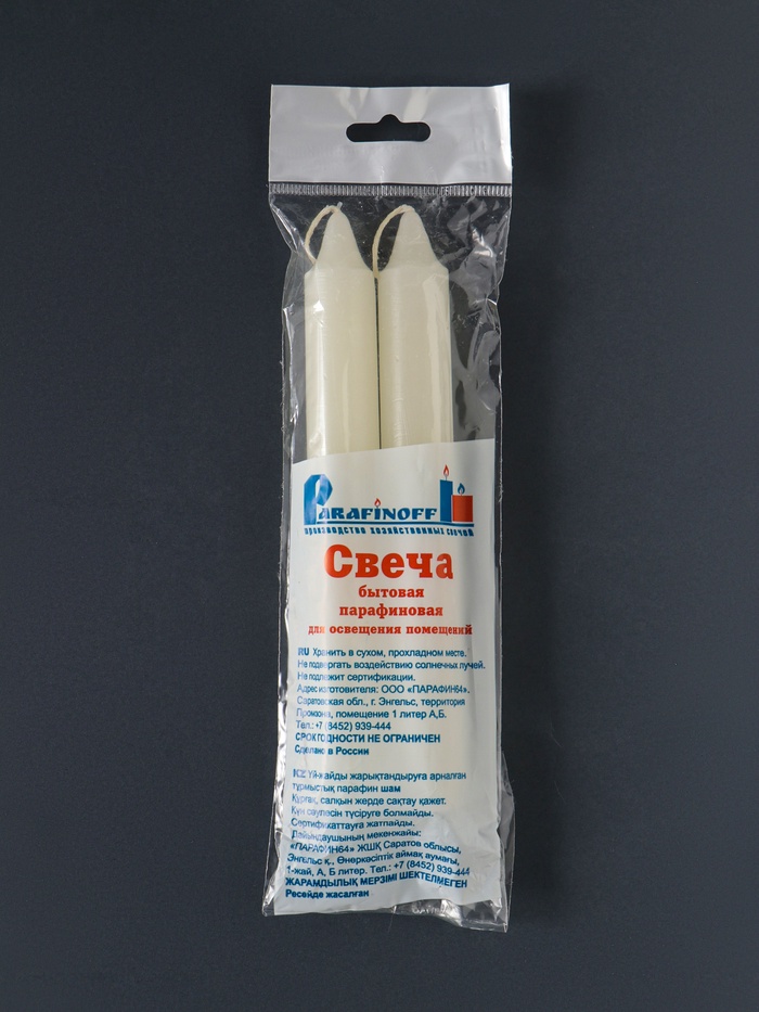 Набор из двух высоких хозяйственных свечей — это готовое решение для длительного освещения и создания уюта. Парафиновые свечи горят ровно и долго, не требуя постоянного внимания. Идеальный запас для дома на случай отключения электричества или для спокойного вечера при мягком свете.