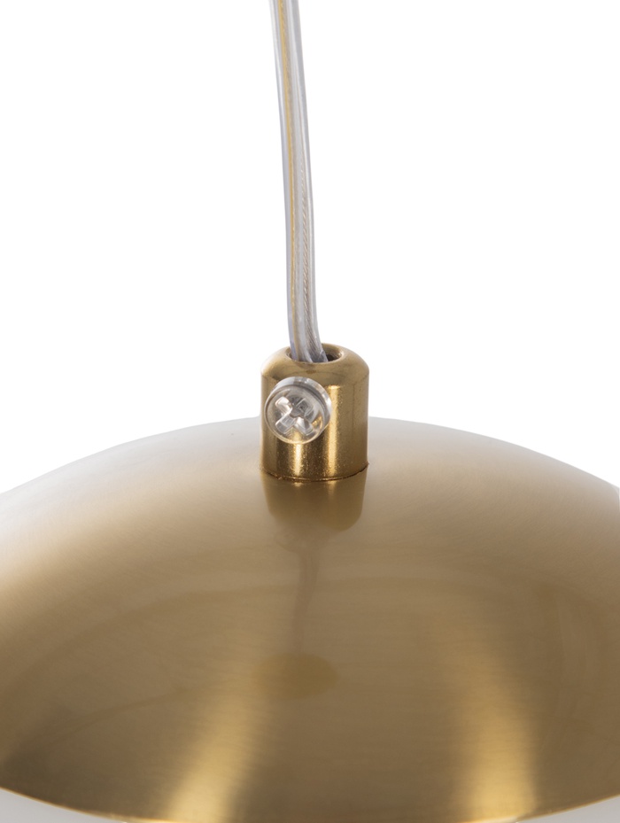 Подвесной светильник с золотистым металлическим основанием и белым стеклянным шарообразным плафоном создаёт сбалансированное, комфортное освещение и служит стильным акцентом в современном интерьере. Его минималистичный силуэт хорошо смотрится в залах, кухнях и спальнях, не отвлекая внимание от общей дизайнерской концепции, но при этом подчёркивая утончённый вкус хозяев.